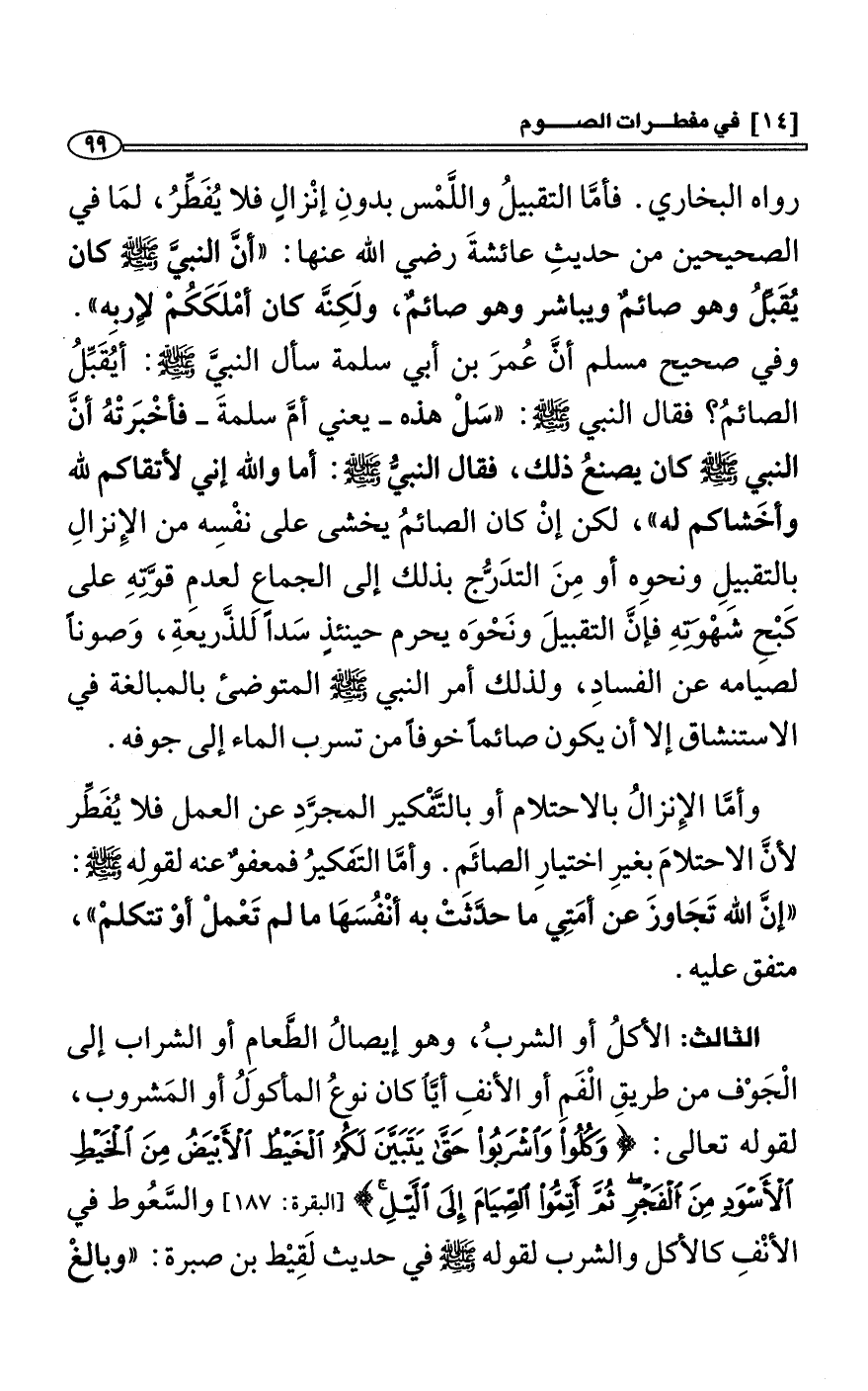 رواه البخاري. فأمَّا التقبيلُ واللَّمْس بدونِ إنْزالٍ فلا يُفَطِّرُ، لمَا في الصحيحين من حديثِ عائشةَ رضي الله عنها: «أنَّ النبيَّ صلى الله عليه وسلّم كان يُقَبِّلُ وهو صائمٌ ويباشر وهو صائمٌ، ولَكِنَّه كان أمْلَكَكُمْ لإِربِه». وفي صحيح مسلم أنَّ عُمرَ بن أبي سلمة سأل النبيَّ صلى الله عليه وسلّم: أيُقَبِّلُ الصائمُ؟ فقال النبي صلى الله عليه وسلّم: «سَلْ هذه ـ يعني أمَّ سلمةَ ـ فأخْبَرتْهُ أنَّ النبي صلى الله عليه وسلّم كان يصنعُ ذلك، فقال النبيُّ صلى الله عليه وسلّم: أما والله إني لأتقاكم لله وأخَشاكم له»، لكن إنْ كان الصائمُ يخشى على نفْسِه من الإِنزالِ بالتقبيلِ ونحوِه أو مِنَ التدَرُّج بذلك إلى الجماعِ لعدمِ قوَّتِهِ على كَبْحِ شَهْوَتِهِ فإنَّ التقبيلَ ونَحْوَه يحرم حينئذٍ سَداً للذَّريعةِ، وَصوناً لصيامه عن الفسادِ، ولذلك أمر النبي صلى الله عليه وسلّم المتوضأ بالمبالغة في الاستنشاق إلا أن يكون صائماً خوفاً من تسرب الماء إلى جوفه.