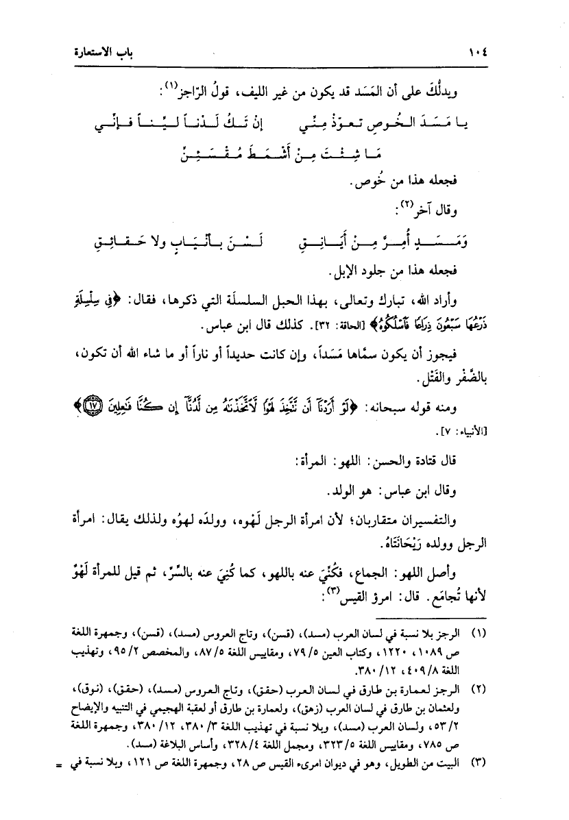 (1) الرجز بلا نسبة في لسان العرب (مسد) ، (قسن) ، وتاج العروس (مسد) ، (قسن) ، وجمهرة اللغة ص 1089، 1220، وكتاب العين 5/ 79، ومقاييس اللغة 5/ 87، والمخصص 2/ 95، وتهذيب اللغة 8/ 409، 12/ 380.