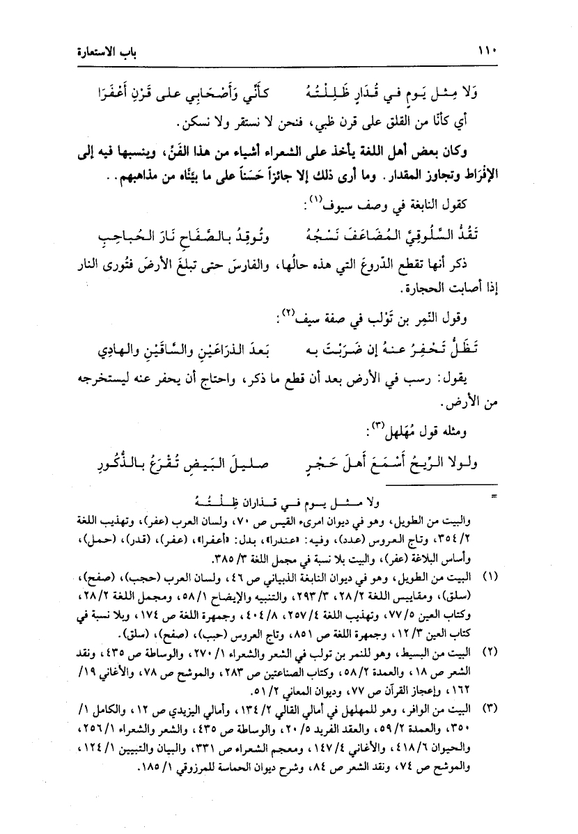 وكان بعض أهل اللغة يأخذ على الشعراء أشياء من هذا الفنّ، وينسبها فيه إلى الإفراط وتجاوز المقدار. وما أرى ذلك إلا جائزا حسنا على ما بيّنّاه من مذاهبهم..