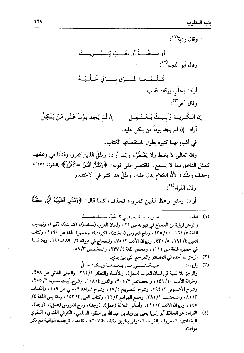 (4) الفراء: هو الحافظ أبو زكريا يحيى بن زياد بن عبد الله بن منظور الديلمي، الكوفي اللغوي، المقري البغدادي، المعروف بالفراء، المتوفى بطريق مكة سنة 207 هـ، تقدمت ترجمته الوافية مع ذكر مؤلفاته.