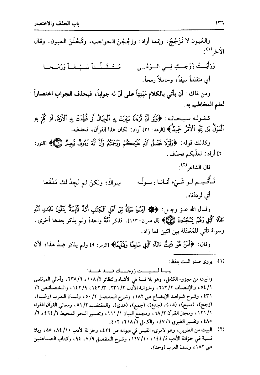 ومن ذلك: أن يأتي بالكلام مبنيّا على أنّ له جوابا، فيحذف الجواب اختصارا لعلم المخاطب به.