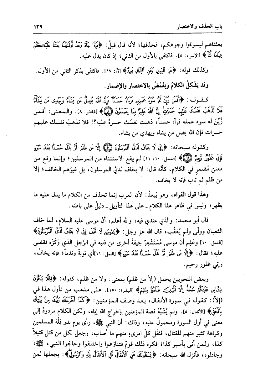 قال أبو محمد: والذي عندي فيه، والله أعلم، أنّ موسى عليه السلام، لما خاف الثعبان وولّى ولم يعقّب، قال الله عز وجل: يا مُوسى لا تَخَفْ إِنِّي لا يَخافُ لَدَيَّ الْمُرْسَلُونَ [النمل: 10] وعلم أن موسى مستشعر خيفة أخرى من ذنبه في الرّجل الّذي وكزه فقضى عليه، فقال: إِلَّا مَنْ ظَلَمَ ثُمَّ بَدَّلَ حُسْناً بَعْدَ سُوءٍ [النمل: 11] أي توبة وندما، فإنه يخاف، وإني غفور رحيم.