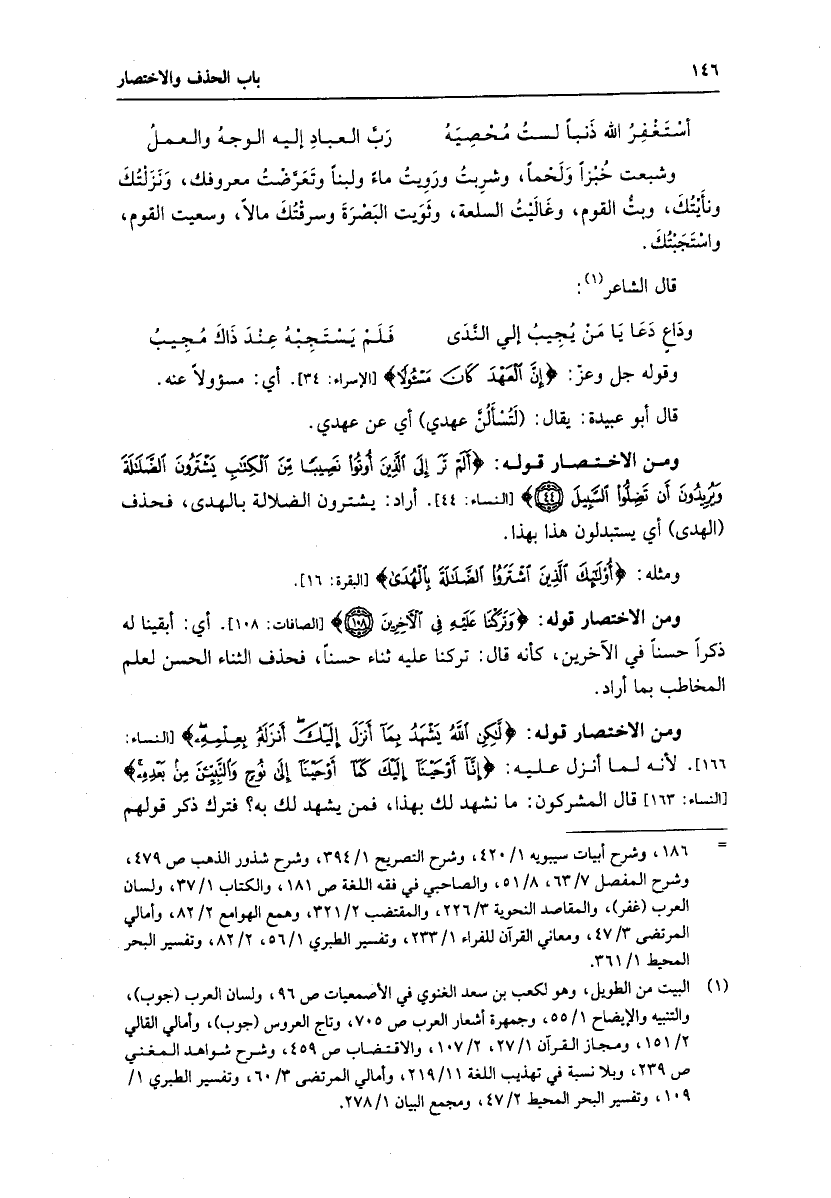 ومن الاختصار قوله: أَلَمْ تَرَ إِلَى الَّذِينَ أُوتُوا نَصِيباً مِنَ الْكِتابِ يَشْتَرُونَ الضَّلالَةَ وَيُرِيدُونَ أَنْ تَضِلُّوا السَّبِيلَ (44) [النساء: 44] . أراد: يشترون الضلالة بالهدى، فحذف (الهدى) أي يستبدلون هذا بهذا.