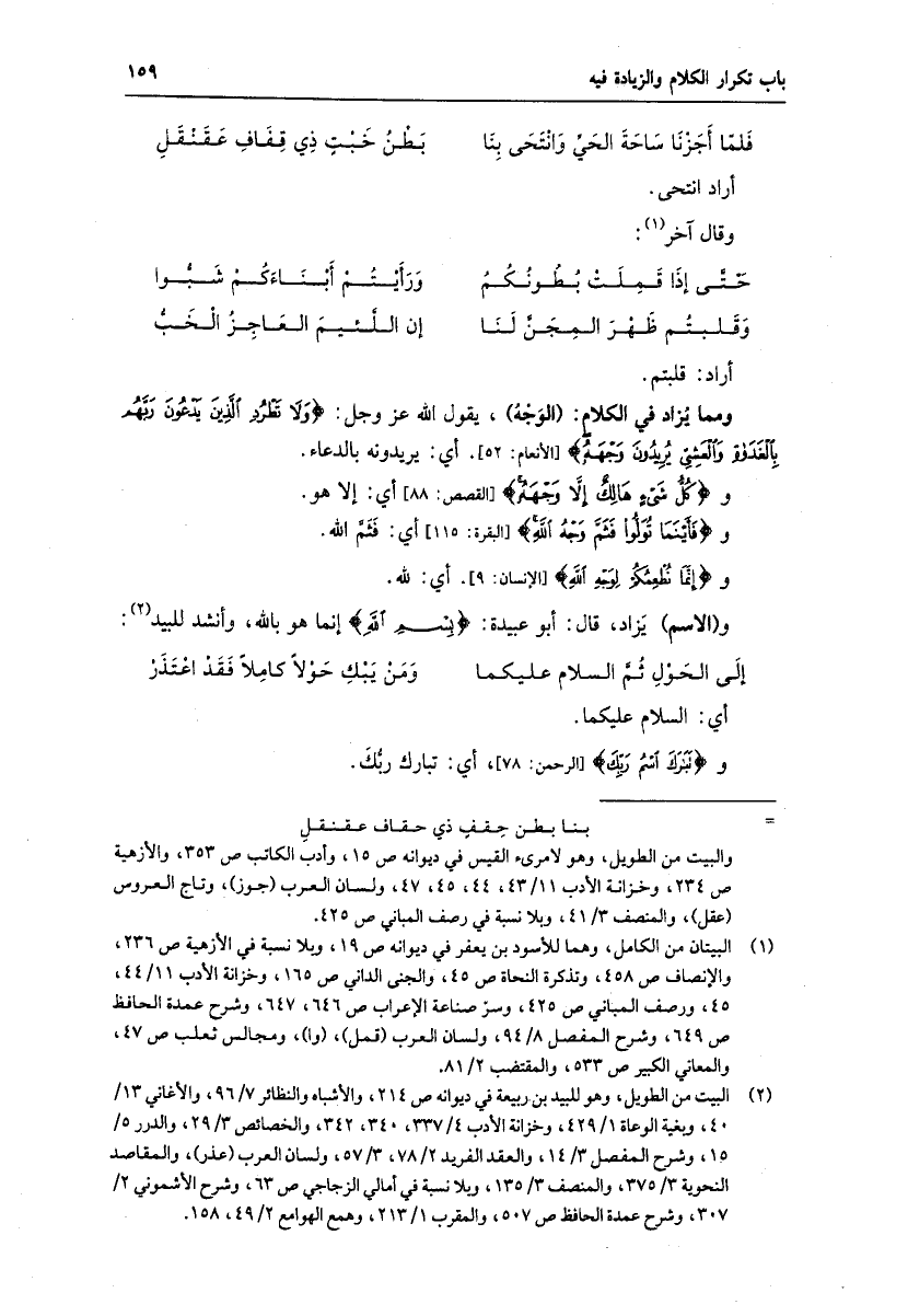 ومما يزاد في الكلام: (الوجه) ، يقول الله عز وجل: وَلا تَطْرُدِ الَّذِينَ يَدْعُونَ رَبَّهُمْ بِالْغَداةِ وَالْعَشِيِّ يُرِيدُونَ وَجْهَهُ [الأنعام: 52] . أي: يريدونه بالدعاء.