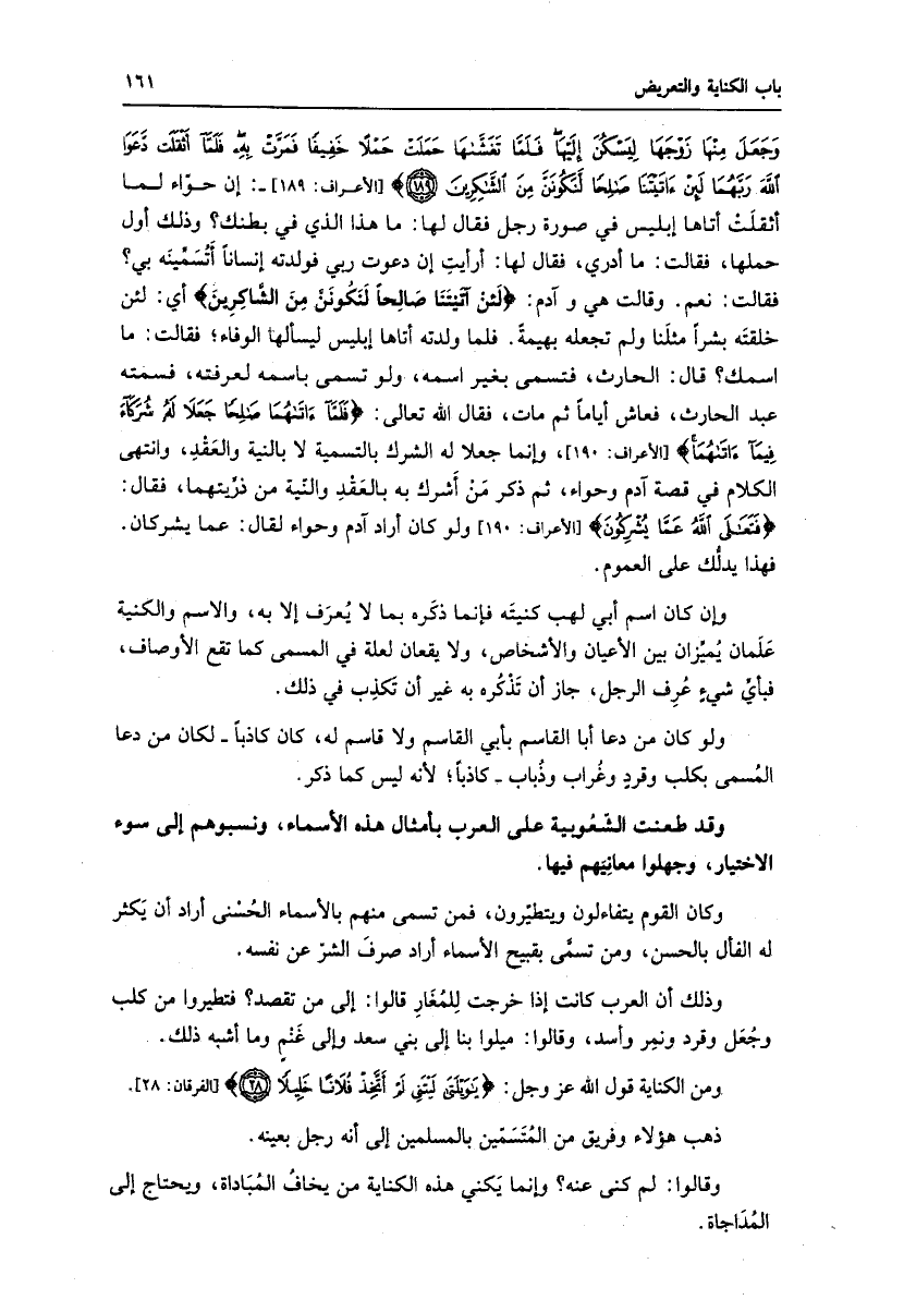 وإن كان اسم أبي لهب كنيته فإنما ذكره بما لا يعرف إلا به، والاسم والكنية علمان يميّزان بين الأعيان والأشخاص، ولا يقعان لعلة في المسمى كما تقع الأوصاف، فبأيّ شيء عرف الرجل، جاز أن تذكره به غير أن تكذب في ذلك.