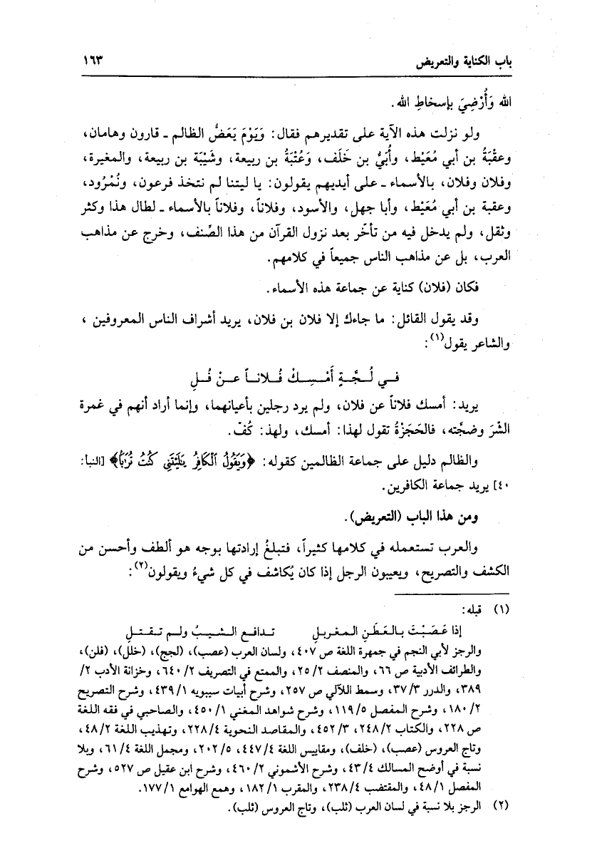 والعرب تستعمله في كلامها كثيرا، فتبلغ إرادتها بوجه هو ألطف وأحسن من الكشف والتصريح، ويعيبون الرجل إذا كان يكاشف في كل شيء ويقولون «2» :