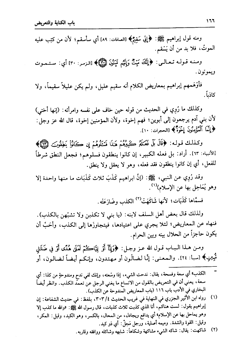 وكذلك ما روي في الحديث من قوله حين خاف على نفسه وامرأته: (إنها أختي) لأن بني آدم يرجعون إلى أبوين، فهم إخوة، ولأن المؤمنين إخوة، قال الله عز وجل: