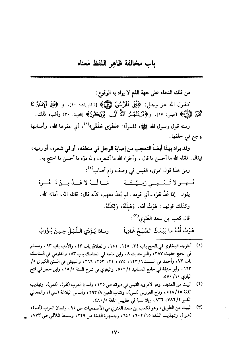 كقول الله عز وجل: قُتِلَ الْخَرَّاصُونَ (10) [الذاريات: 10] ، وقُتِلَ الْإِنْسانُ ما أَكْفَرَهُ (17) [عبس: 17] ، وقاتَلَهُمُ اللَّهُ أَنَّى يُؤْفَكُونَ [التوبة: 30] وأشباه ذلك.