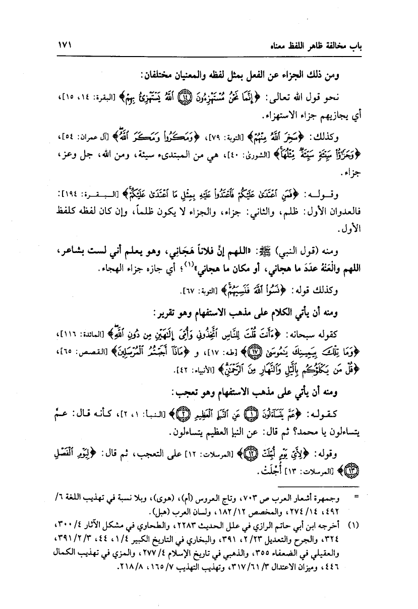 نحو قول الله تعالى: إِنَّما نَحْنُ مُسْتَهْزِؤُنَ (14) اللَّهُ يَسْتَهْزِئُ بِهِمْ [البقرة: 14، 15] ، أي يجازيهم جزاء الاستهزاء.