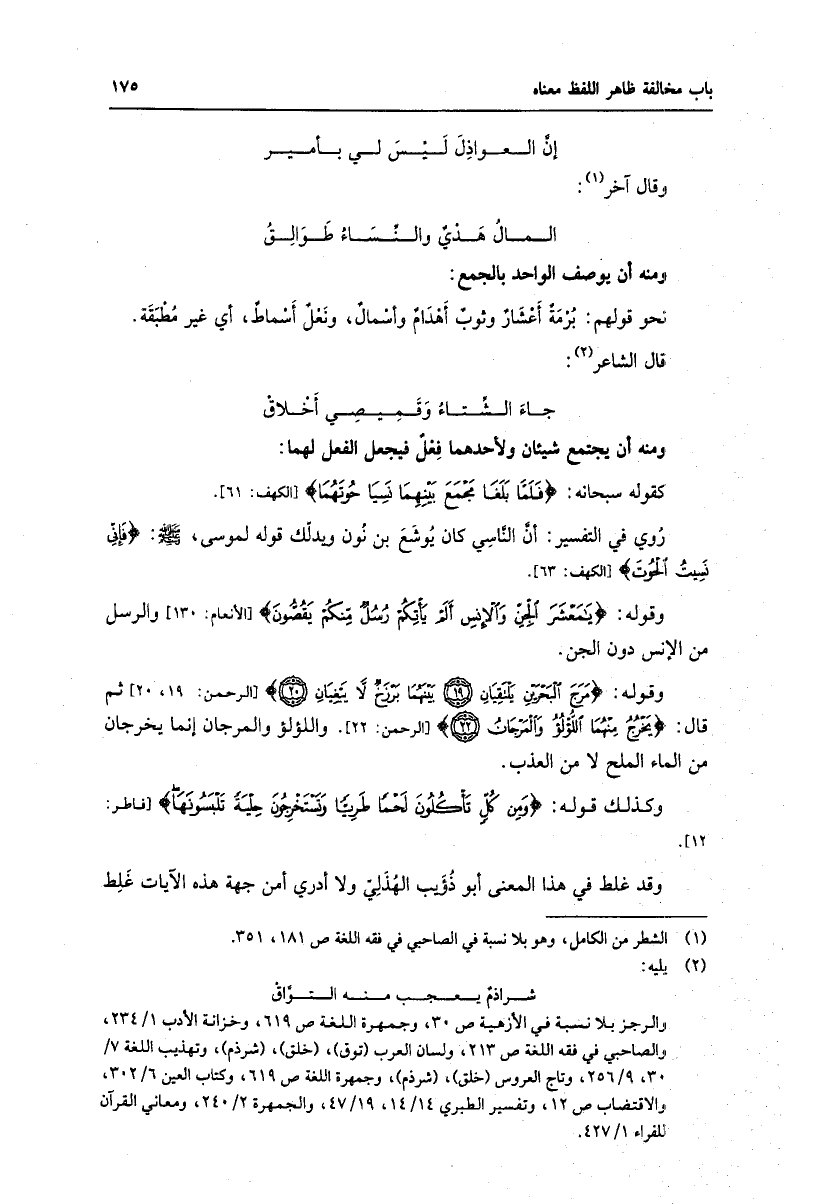 وقوله: مَرَجَ الْبَحْرَيْنِ يَلْتَقِيانِ (19) بَيْنَهُما بَرْزَخٌ لا يَبْغِيانِ (20) [الرحمن: 19، 20] ثم قال: يَخْرُجُ مِنْهُمَا اللُّؤْلُؤُ وَالْمَرْجانُ (22) [الرحمن: 22] . واللؤلؤ والمرجان إنما يخرجان من الماء الملح لا من العذب.