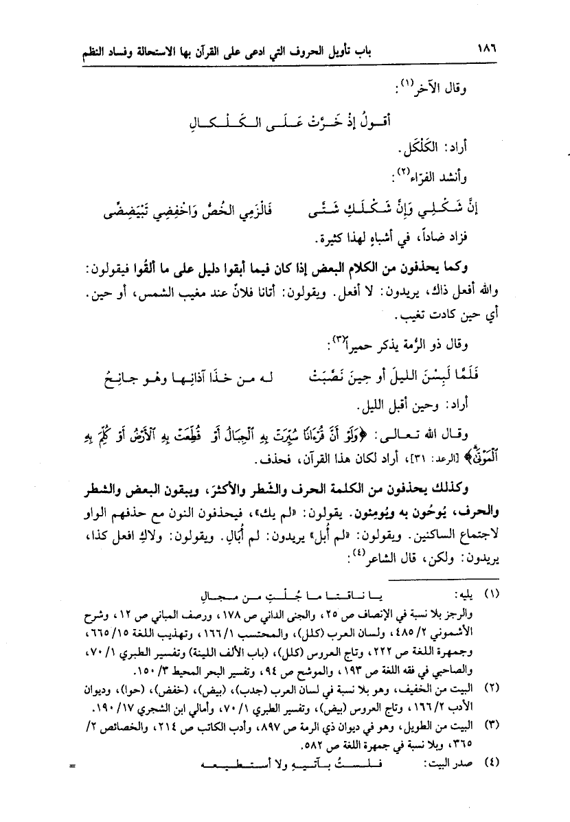 وكذلك يحذفون من الكلمة الحرف والشّطر والأكثر، ويبقون البعض والشطر والحرف، يوحون به ويومئون. يقولون: «لم يك» ، فيحذفون النون مع حذفهم الواو لاجتماع الساكنين. ويقولون: «لم أبل» يريدون: لم أبال. ويقولون: ولاك افعل كذا، يريدون: ولكن، قال الشاعر «4» :