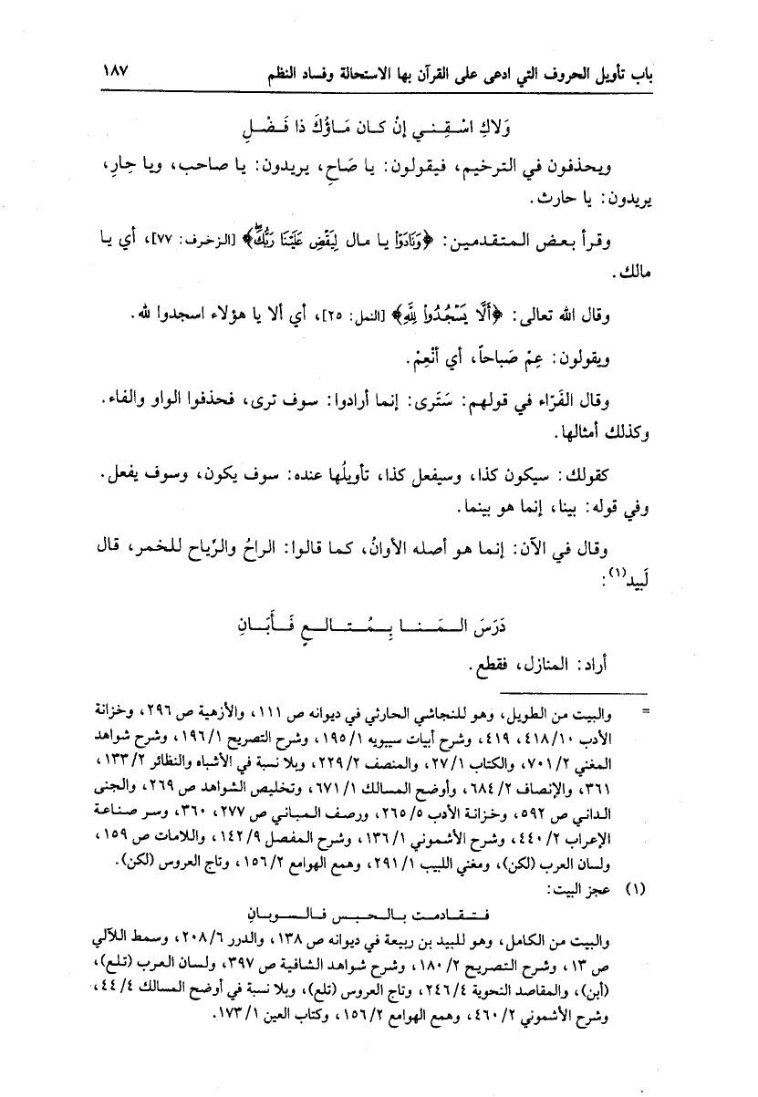 ولاك اسقني إن كان ماؤك ذا فضل ويحذفون في الترخيم، فيقولون: يا صاح، يريدون: يا صاحب، ويا حار، يريدون: يا حارث.