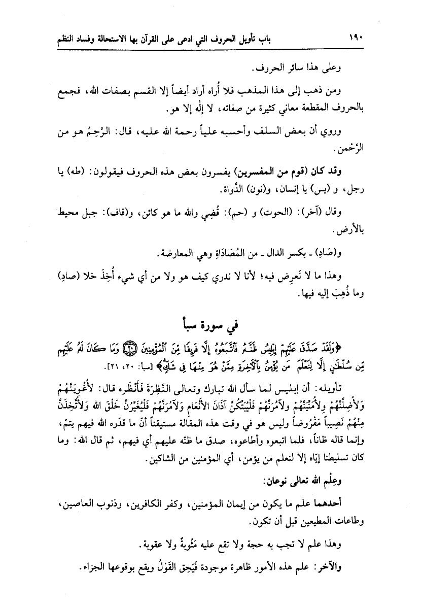 تأويله: أن إبليس لما سأل الله تبارك وتعالى النّظرة فأنظره قال: لأغوينّهم ولأضلّنّهم ولأمنّينّهم ولآمرنّهم فليبتّكنّ آذان الأنعام ولآمرنّهم فليغيّرنّ خلق الله ولأتّخذنّ منهم نصيبا مفروضا وليس هو في وقت هذه المقالة مستيقنا أنّ ما قدّره الله فيهم يتمّ، وإنما قاله ظانا، فلما اتبعوه وأطاعوه، صدق ما ظنّه عليهم أي فيهم، ثم قال الله: وما كان تسليطنا إيّاه إلا لنعلم من يؤمن، أي المؤمنين من الشاكين.