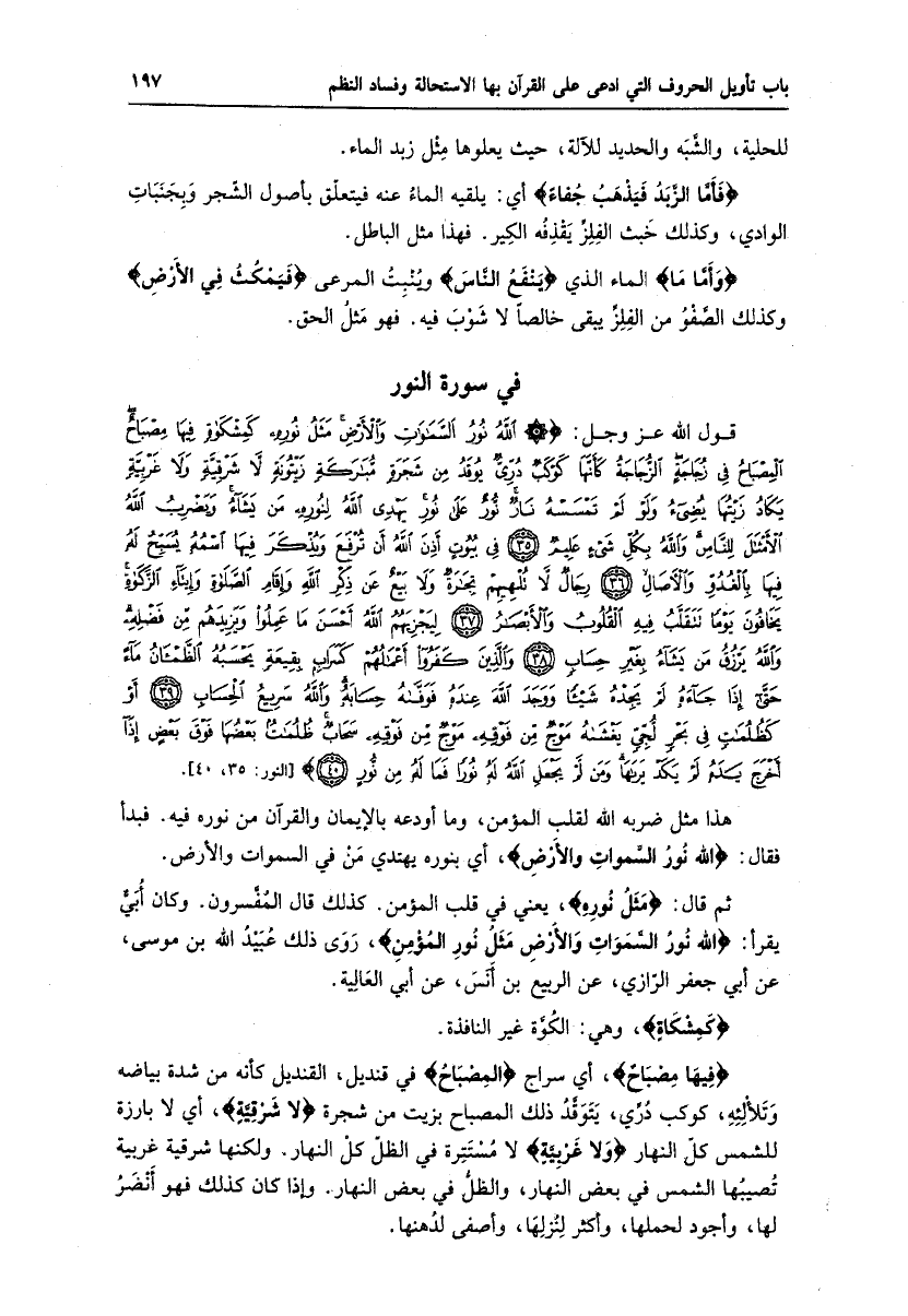 قول الله عز وجل: اللَّهُ نُورُ السَّماواتِ وَالْأَرْضِ مَثَلُ نُورِهِ كَمِشْكاةٍ فِيها مِصْباحٌ الْمِصْباحُ فِي زُجاجَةٍ الزُّجاجَةُ كَأَنَّها كَوْكَبٌ دُرِّيٌّ يُوقَدُ مِنْ شَجَرَةٍ مُبارَكَةٍ زَيْتُونَةٍ لا شَرْقِيَّةٍ وَلا غَرْبِيَّةٍ يَكادُ زَيْتُها يُضِيءُ وَلَوْ لَمْ تَمْسَسْهُ نارٌ نُورٌ عَلى نُورٍ يَهْدِي اللَّهُ لِنُورِهِ مَنْ يَشاءُ وَيَضْرِبُ اللَّهُ الْأَمْثالَ لِلنَّاسِ وَاللَّهُ بِكُلِّ شَيْءٍ عَلِيمٌ (35) فِي بُيُوتٍ أَذِنَ اللَّهُ أَنْ تُرْفَعَ وَيُذْكَرَ فِيهَا اسْمُهُ يُسَبِّحُ لَهُ فِيها بِالْغُدُوِّ وَالْآصالِ (36) رِجالٌ لا تُلْهِيهِمْ تِجارَةٌ وَلا بَيْعٌ عَنْ ذِكْرِ اللَّهِ وَإِقامِ الصَّلاةِ وَإِيتاءِ الزَّكاةِ يَخافُونَ يَوْماً تَتَقَلَّبُ فِيهِ الْقُلُوبُ وَالْأَبْصارُ (37) لِيَجْزِيَهُمُ اللَّهُ أَحْسَنَ ما عَمِلُوا وَيَزِيدَهُمْ مِنْ فَضْلِهِ وَاللَّهُ يَرْزُقُ مَنْ يَشاءُ بِغَيْرِ حِسابٍ (38) وَالَّذِينَ كَفَرُوا أَعْمالُهُمْ كَسَرابٍ بِقِيعَةٍ يَحْسَبُهُ الظَّمْآنُ ماءً حَتَّى إِذا جاءَهُ لَمْ يَجِدْهُ شَيْئاً وَوَجَدَ اللَّهَ عِنْدَهُ فَوَفَّاهُ حِسابَهُ وَاللَّهُ سَرِيعُ الْحِسابِ (39) أَوْ كَظُلُماتٍ فِي بَحْرٍ لُجِّيٍّ يَغْشاهُ مَوْجٌ مِنْ فَوْقِهِ مَوْجٌ مِنْ فَوْقِهِ سَحابٌ ظُلُماتٌ بَعْضُها فَوْقَ بَعْضٍ إِذا أَخْرَجَ يَدَهُ لَمْ يَكَدْ يَراها وَمَنْ لَمْ يَجْعَلِ اللَّهُ لَهُ نُوراً فَما لَهُ مِنْ نُورٍ (40) [النور: 35، 40] .