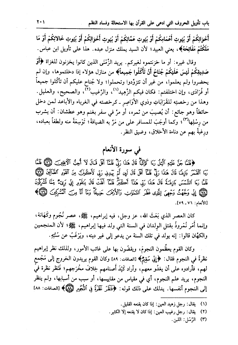 وكان القوم يعظّمون النجوم، ويقضون بها على غائب الأمور، ولذلك نظر إبراهيم نظرة في النجوم فقال: إِنِّي سَقِيمٌ [الصافات: 89] وكان القوم يريدون الخروج إلى مجمع لهم، فأرادوه على أن يغدو معهم، وأراد كيد أصنامهم خلاف مخرجهم، فنظر نظرة في النجوم، يريد علم النجوم، أي في مقياس من مقاييسها، أو سبب من أسبابها، ولم ينظر إلى النجوم أنفسها. يدلك على ذلك قوله: فَنَظَرَ نَظْرَةً فِي النُّجُومِ (88) [الصافات: 88]