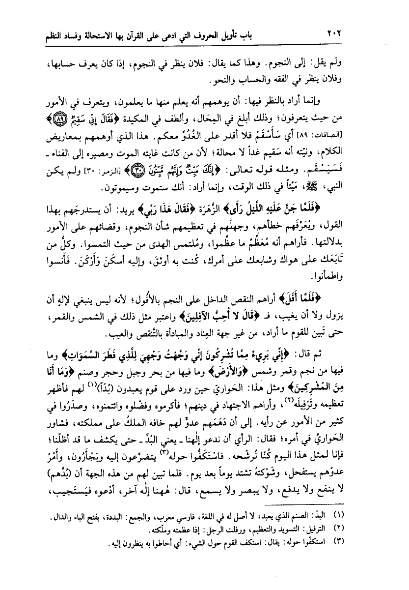 فَلَمَّا أَفَلَ أراهم النقص الداخل على النجم بالأفول، لأنه ليس ينبغي لإله أن يزول ولا أن يغيب، ف قالَ لا أُحِبُّ الْآفِلِينَ واعتبر مثل ذلك في الشمس والقمر، حتى تبين للقوم ما أراد، من غير جهة العناد والمبادأة بالتّنقص والعيب.