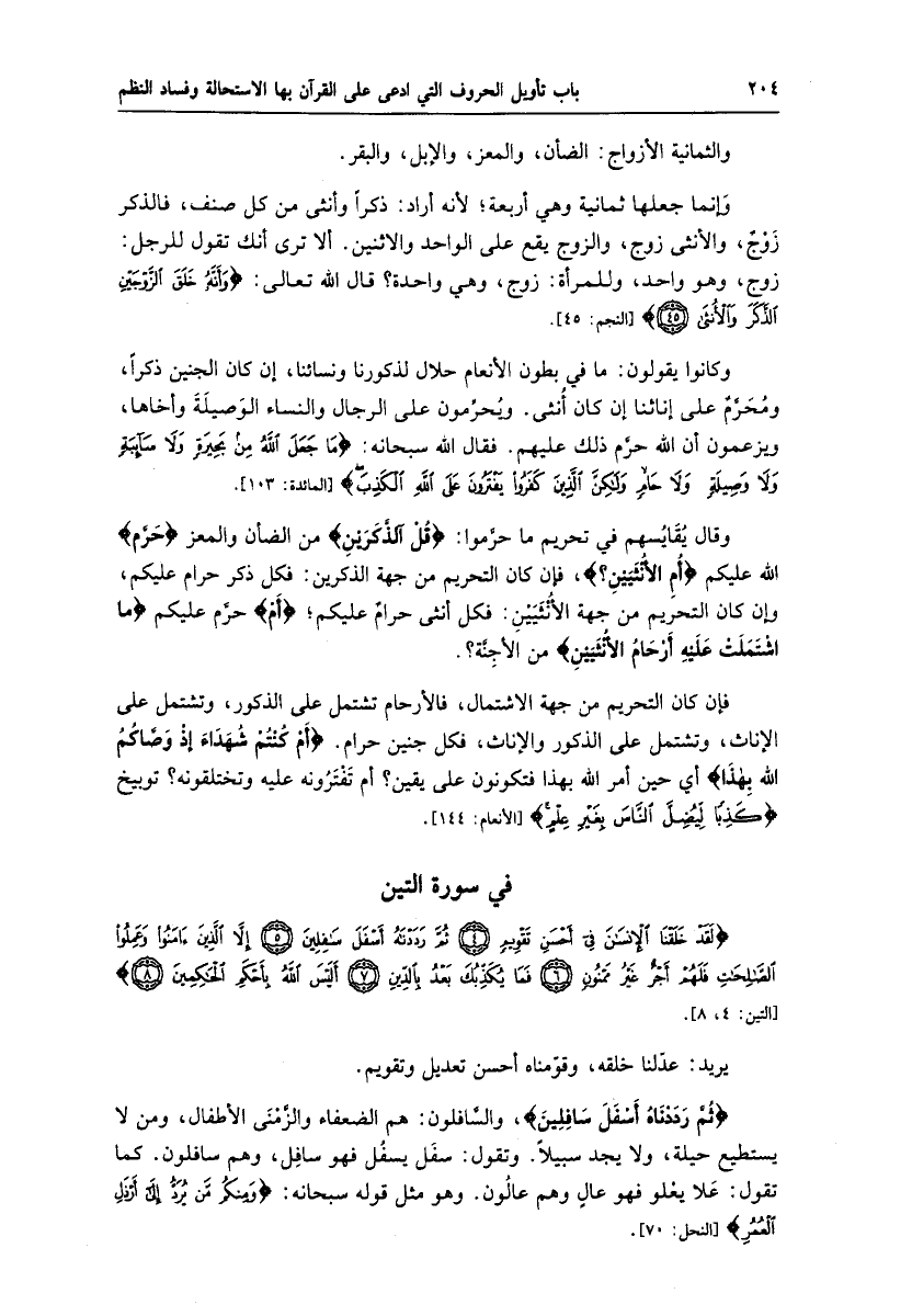 وقال يقايسهم في تحريم ما حرّموا: قُلْ آلذَّكَرَيْنِ من الضأن والمعز حَرَّمَ الله عليكم أَمِ الْأُنْثَيَيْنِ؟، فإن كان التحريم من جهة الذكرين: فكل ذكر حرام عليكم، وإن كان التحريم من جهة الأنثيين: فكل أنثى حرام عليكم، أَمِ حرّم عليكم أَمَّا اشْتَمَلَتْ عَلَيْهِ أَرْحامُ الْأُنْثَيَيْنِ من الأجنّة؟.