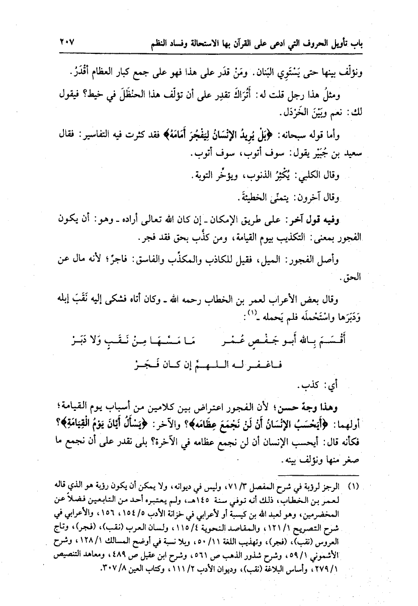 وهذا وجه حسن لأن الفجور اعتراض بين كلامين من أسباب يوم القيامة، أولهما: أَيَحْسَبُ الْإِنْسانُ أَلَّنْ نَجْمَعَ عِظامَهُ؟ والآخر: يَسْئَلُ أَيَّانَ يَوْمُ الْقِيامَةِ؟