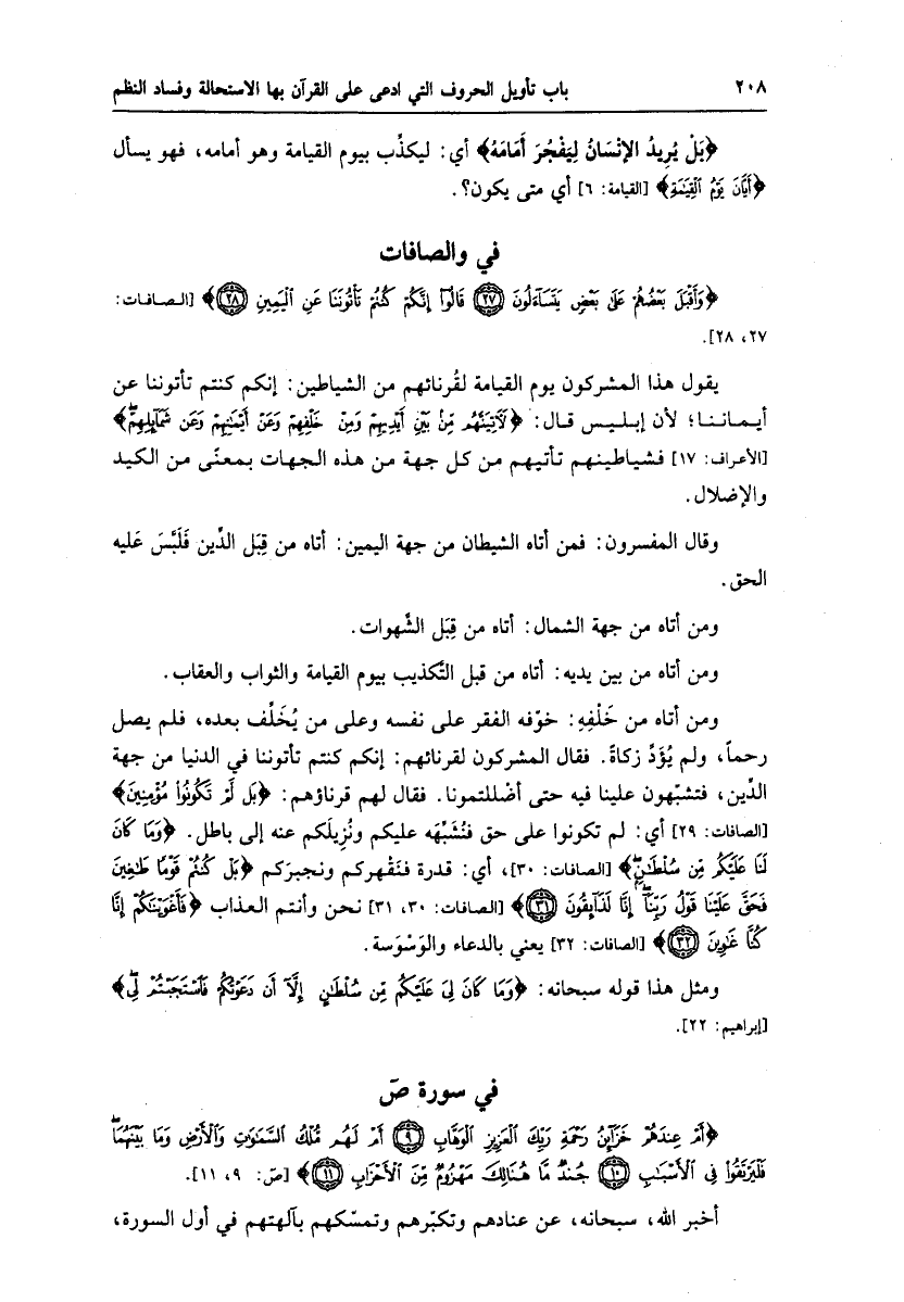 ومن أتاه من خلفه: خوّفه الفقر على نفسه وعلى من يخلّف بعده، فلم يصل رحما، ولم يؤدّ زكاة. فقال المشركون لقرنائهم: إنكم كنتم تأتوننا في الدنيا من جهة الدّين، فتشبّهون علينا فيه حتى أضللتمونا. فقال لهم قرناؤهم: بَلْ لَمْ تَكُونُوا مُؤْمِنِينَ [الصافات: 29] أي: لم تكونوا على حق فنشبّهه عليكم ونزيلكم عنه إلى باطل. وَما كانَ لَنا عَلَيْكُمْ مِنْ سُلْطانٍ [الصافات: 30] ، أي: قدرة فنقهركم ونجبركم بَلْ كُنْتُمْ قَوْماً طاغِينَ فَحَقَّ عَلَيْنا قَوْلُ رَبِّنا إِنَّا لَذائِقُونَ (31) [الصافات: 30، 31] نحن وأنتم العذاب فَأَغْوَيْناكُمْ إِنَّا كُنَّا غاوِينَ (32) [الصافات: 32] يعني بالدعاء والوسوسة.