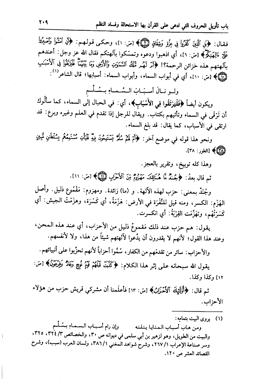 فقال: بَلِ الَّذِينَ كَفَرُوا فِي عِزَّةٍ وَشِقاقٍ (2) [ص: 1] ، وحكى قولهم: أَنِ امْشُوا وَاصْبِرُوا عَلى آلِهَتِكُمْ [ص: 6] ، أي اذهبوا ودعوه وتمسّكوا بآلهتكم فقال الله عز وجل: أعندهم بآلهتهم هذه خزائن الرحمة؟! أَمْ لَهُمْ مُلْكُ السَّماواتِ وَالْأَرْضِ وَما بَيْنَهُما فَلْيَرْتَقُوا فِي الْأَسْبابِ (10) [ص: 10] ، أي في أبواب السماء، وأبواب السماء: أسبابها، قال الشاعر «1» :