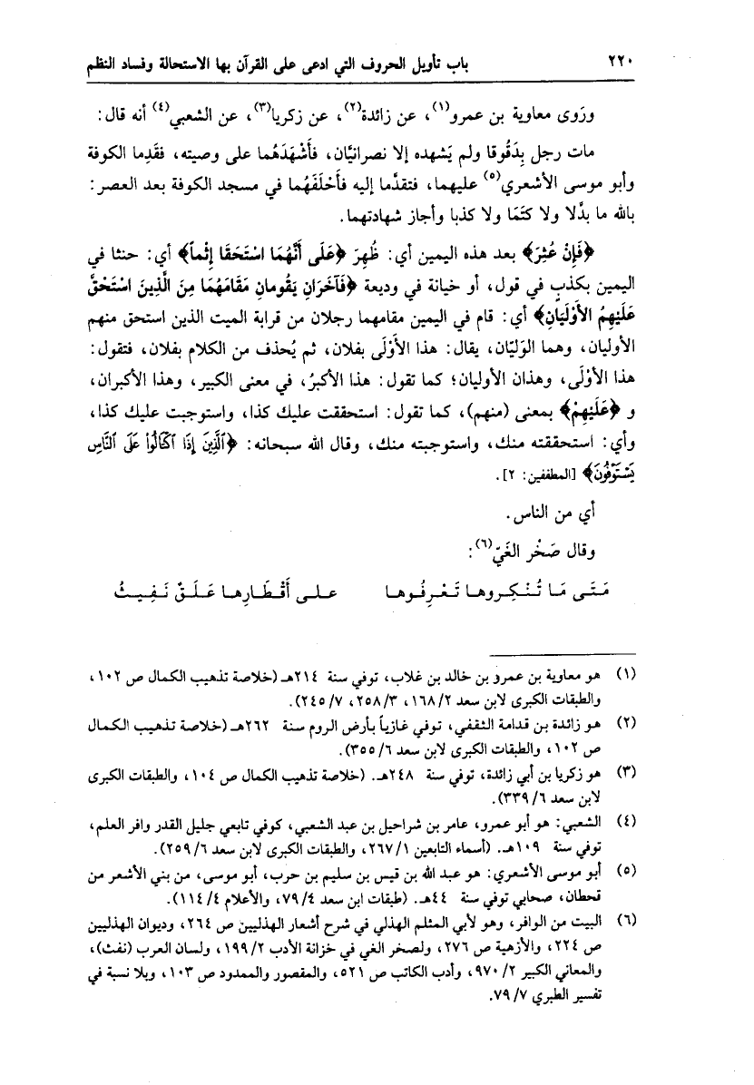 (4) الشعبي: هو أبو عمرو، عامر بن شراحيل بن عبد الشعبي، كوفي تابعي جليل القدر وافر العلم، توفي سنة 109 هـ. (أسماء التابعين 1/ 267، والطبقات الكبرى لابن سعد 6/ 259) .