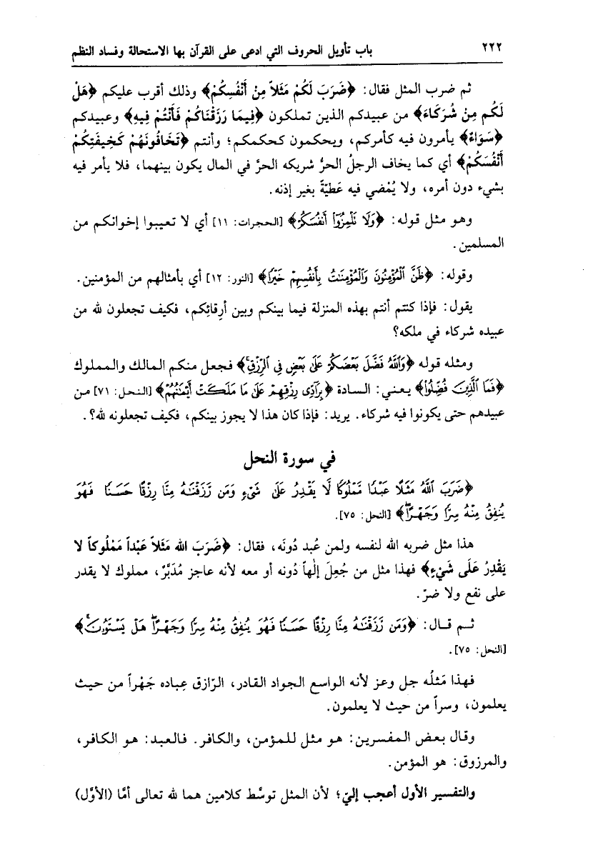 ومثله قوله وَاللَّهُ فَضَّلَ بَعْضَكُمْ عَلى بَعْضٍ فِي الرِّزْقِ فجعل منكم المالك والمملوك فَمَا الَّذِينَ فُضِّلُوا يعني: السادة بِرَادِّي رِزْقِهِمْ عَلى ما مَلَكَتْ أَيْمانُهُمْ [النحل: 71] من عبيدهم حتى يكونوا فيه شركاء. يريد: فإذا كان هذا لا يجوز بينكم، فكيف تجعلونه لله؟.