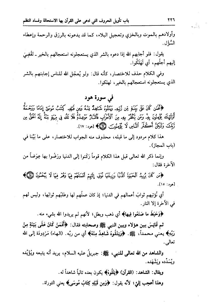 أَفَمَنْ كانَ عَلى بَيِّنَةٍ مِنْ رَبِّهِ وَيَتْلُوهُ شاهِدٌ مِنْهُ وَمِنْ قَبْلِهِ كِتابُ مُوسى إِماماً وَرَحْمَةً أُولئِكَ يُؤْمِنُونَ بِهِ وَمَنْ يَكْفُرْ بِهِ مِنَ الْأَحْزابِ فَالنَّارُ مَوْعِدُهُ فَلا تَكُ فِي مِرْيَةٍ مِنْهُ إِنَّهُ الْحَقُّ مِنْ رَبِّكَ وَلكِنَّ أَكْثَرَ النَّاسِ لا يُؤْمِنُونَ (17) [هود: 17] .