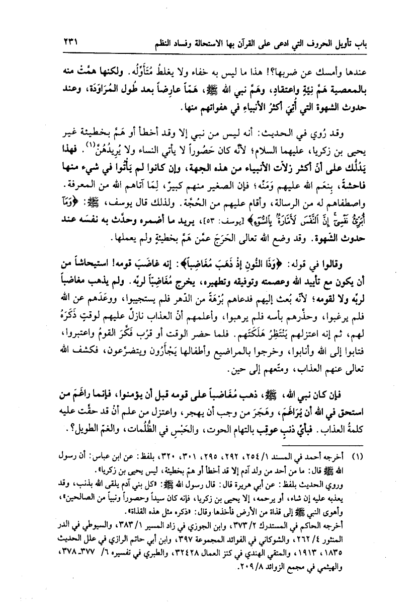 فإن كان نبي الله، صلّى الله عليه وسلم، ذهب مغاضبا على قومه قبل أن يؤمنوا، فإنما راغم من استحق في الله أن يراغم، وهجر من وجب أن يهجر، واعتزل من علم أن قد حقّت عليه كلمة العذاب. فبأيّ ذنب عوقب بالتهام الحوت، والحبس في الظّلمات، والغمّ الطويل؟.