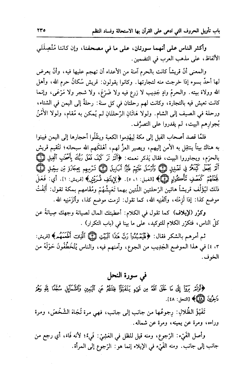 فلمّا قصد أصحاب الفيل إلى مكة ليهدموا الكعبة وينقلوا أحجارها إلى اليمن فيبنوا به هناك بيتا ينتقل به الأمن إليهم، ويصير العزّ لهم، أهلكهم الله سبحانه، لتقيم قريش بالحرم، ويجاوروا البيت، فقال يذكر نعمته: أَلَمْ تَرَ كَيْفَ فَعَلَ رَبُّكَ بِأَصْحابِ الْفِيلِ (1) أَلَمْ يَجْعَلْ كَيْدَهُمْ فِي تَضْلِيلٍ (2) وَأَرْسَلَ عَلَيْهِمْ طَيْراً أَبابِيلَ (3) تَرْمِيهِمْ بِحِجارَةٍ مِنْ سِجِّيلٍ (4) فَجَعَلَهُمْ كَعَصْفٍ مَأْكُولٍ (5) [الفيل: 1، 5] . لِإِيلافِ قُرَيْشٍ [قريش: 1] . أي: فعل ذلك ليؤلّف قريشا هاتين الرّحلتين اللّتين بهما تعيشّهم ومقامهم بمكة تقول: ألفت موضع كذا: إذا لزمته، وآلفنيه الله، كما تقول: لزمت موضع كذا، وألزمنيه الله.