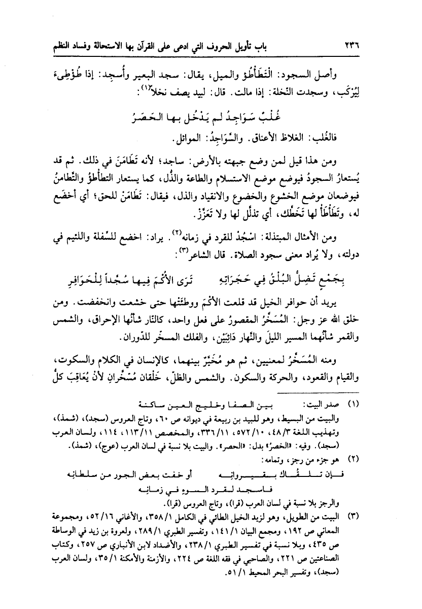 (3) البيت من الطويل، وهو لزيد الخيل الطائي في الكامل 1/ 358، والأغاني 16/ 52، ومجموعة المعاني ص 192،، ومجمع البيان 1/ 141، وتفسير الطبري 1/ 289، ولعروة بن زيد في الوساطة ص 435، وبلا نسبة في تفسير الطبري 1/ 238، والأضداد لابن الأنباري ص 257، وكتاب الصناعتين ص 221، والصاحبي في فقه اللغة ص 224، والأزمنة والأمكنة 1/ 35، ولسان العرب (سجد) ، وتفسير البحر المحيط 1/ 51.