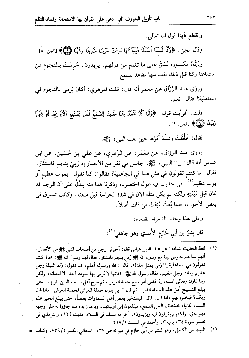 وروى عبد الرزاق، عن معمر، عن الزّهري، عن علي بن حسين، عن ابن عباس أنه قال: بينا النبي، صلّى الله عليه وسلم، جالس في نفر من الأنصار إذ رمي بنجم فاستنار، فقال: ما كنتم تقولون في مثل هذا في الجاهلية؟ فقالوا: كنا نقول: يموت عظيم أو يولد عظيم «1» .