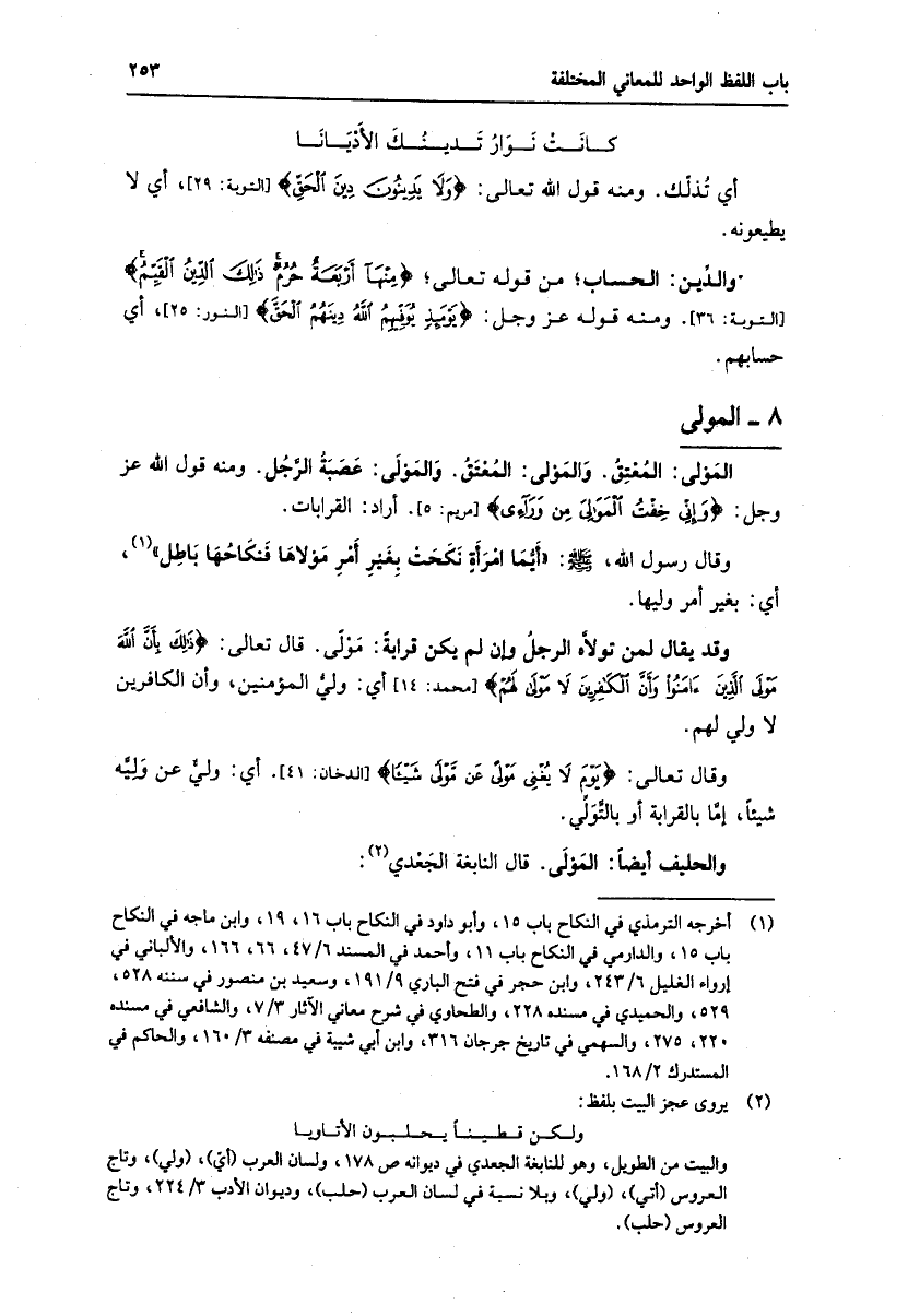 المولى: المعتق. والمولى: المعتق. والمولى: عصبة الرّجل. ومنه قول الله عز وجل: وَإِنِّي خِفْتُ الْمَوالِيَ مِنْ وَرائِي [مريم: 5] . أراد: القرابات.