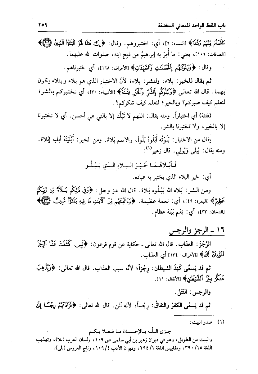ثم يقال للخير: بلاء، وللشر: بلاء، لأنّ الاختبار الذي هو بلاء وابتلاء يكون بهما. قال الله تعالى وَنَبْلُوكُمْ بِالشَّرِّ وَالْخَيْرِ فِتْنَةً [الأنبياء: 35] ، أي نختبركم بالشر، لنعلم كيف صبركم؟ وبالخير، لنعلم كيف شكركم؟.