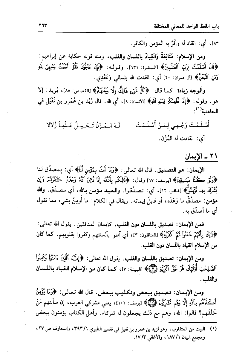 ومن الإيمان: تصديق ببعض وتكذيب ببعض. قال الله تعالى: وَما يُؤْمِنُ أَكْثَرُهُمْ بِاللَّهِ إِلَّا وَهُمْ مُشْرِكُونَ (106) [يوسف: 106] ، يعني مشركي العرب، إن سألتهم من خلقهم؟ قالوا: الله، وهم مع ذلك يجعلون له شركاء. وأهل الكتاب يؤمنون ببعض