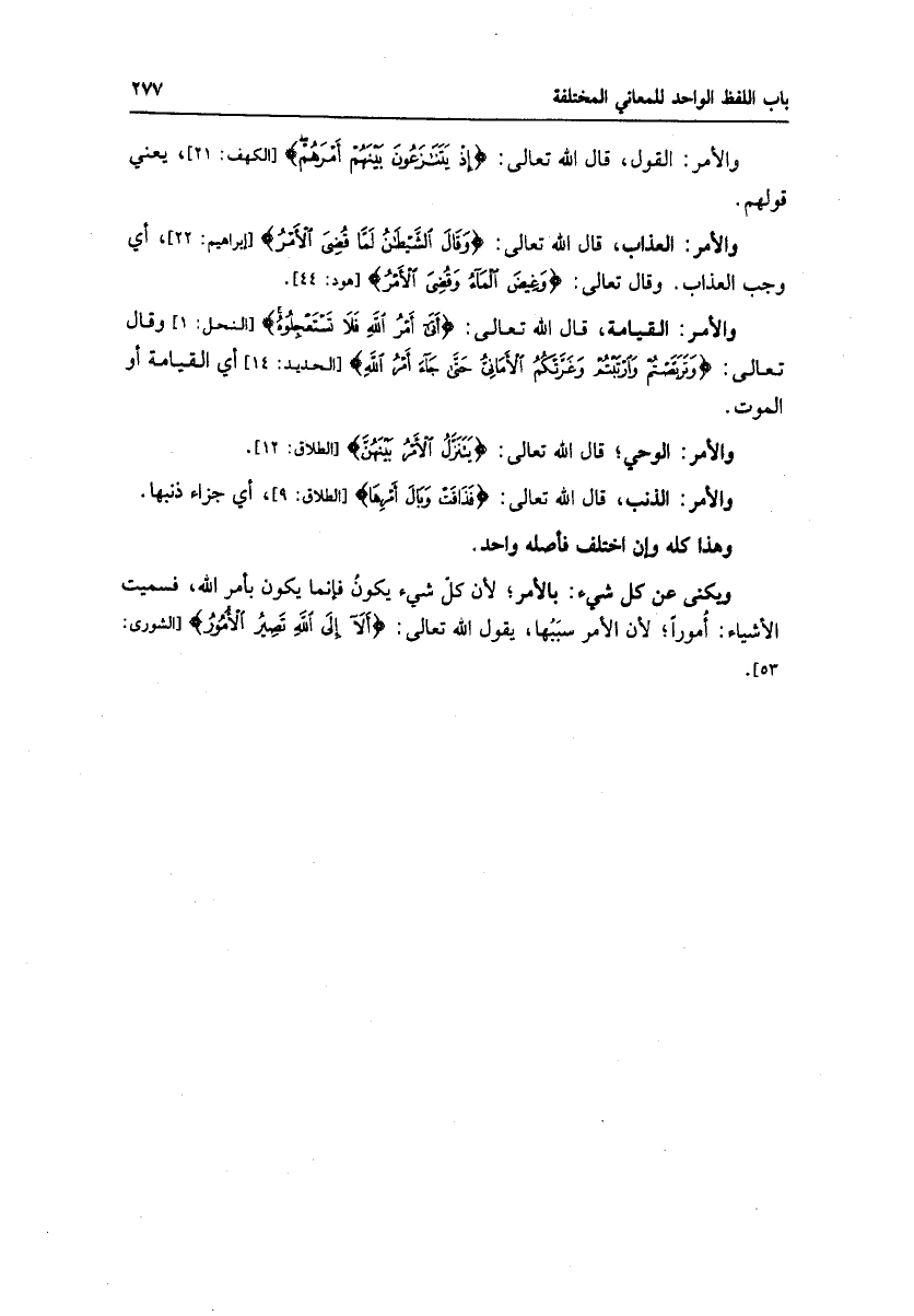 ويكنى عن كل شيء: بالأمر، لأن كلّ شيء يكون فإنما يكون بأمر الله، فسميت الأشياء: أمورا، لأن الأمر سببها، يقول الله تعالى: أَلا إِلَى اللَّهِ تَصِيرُ الْأُمُورُ [الشورى: