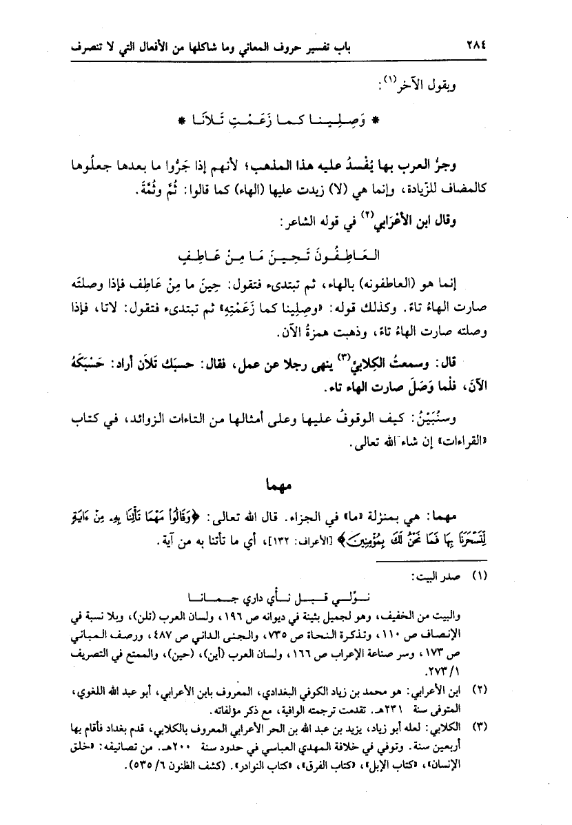 العاطفون تحين ما من عاطف إنما هو (العاطفونه) بالهاء، ثم تبتدئ فتقول: حين ما من عاطف فإذا وصلته صارت الهاء تاء. وكذلك قوله: «وصلينا كما زعمته» ثم تبتدئ فتقول: لاتا، فإذا وصلته صارت الهاء تاء، وذهبت همزة الآن.