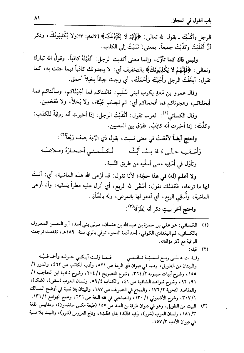 الرجل وأكذبته- بقول الله تعالى: فَإِنَّهُمْ لا يُكَذِّبُونَكَ [الأنعام: 33] ولا يكذبونك، وذكر أنّ أكذبت وكذّبت جميعا، بمعنى: نسبت إلى الكذب.