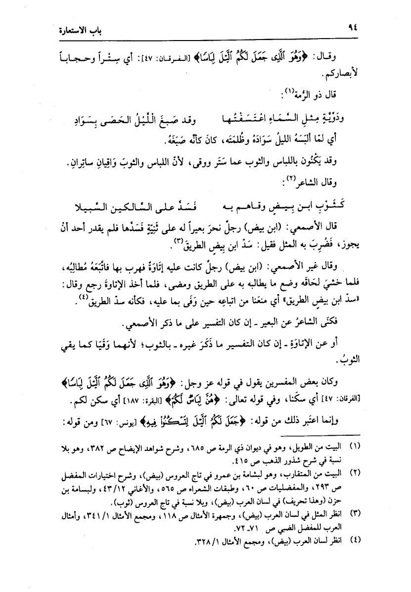 وكان بعض المفسرين يقول في قوله عز وجل: وَهُوَ الَّذِي جَعَلَ لَكُمُ اللَّيْلَ لِباساً [الفرقان: 47] أي سكنا، وفي قوله تعالى: هُنَّ لِباسٌ لَكُمْ [البقرة: 187] أي سكن لكم.