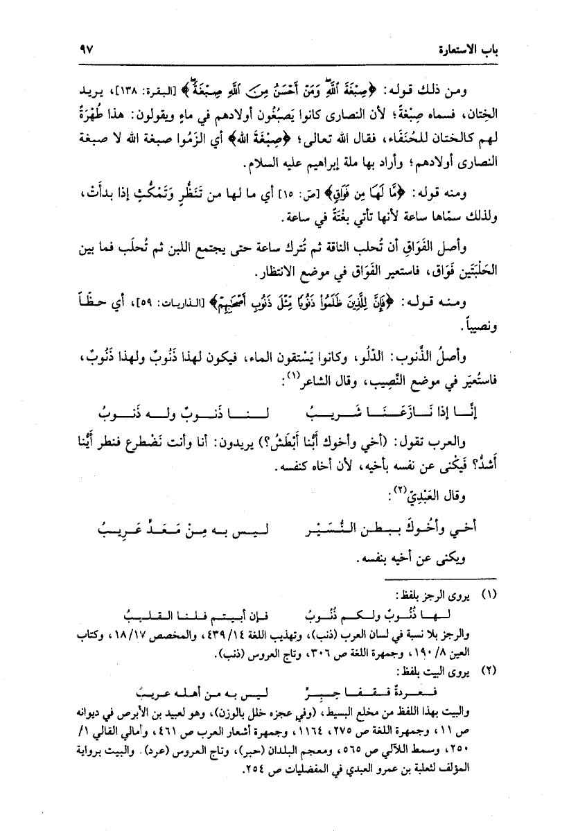 ومن ذلك قوله: صِبْغَةَ اللَّهِ وَمَنْ أَحْسَنُ مِنَ اللَّهِ صِبْغَةً [البقرة: 138] ، يريد الختان، فسماه صبغة، لأن النصارى كانوا يصبغون أولادهم في ماء ويقولون: هذا طهرة لهم كالختان للحنفاء، فقال الله تعالى، صِبْغَةَ اللَّهِ أي الزموا صبغة الله لا صبغة النصارى أولادهم، وأراد بها ملة إبراهيم عليه السلام.