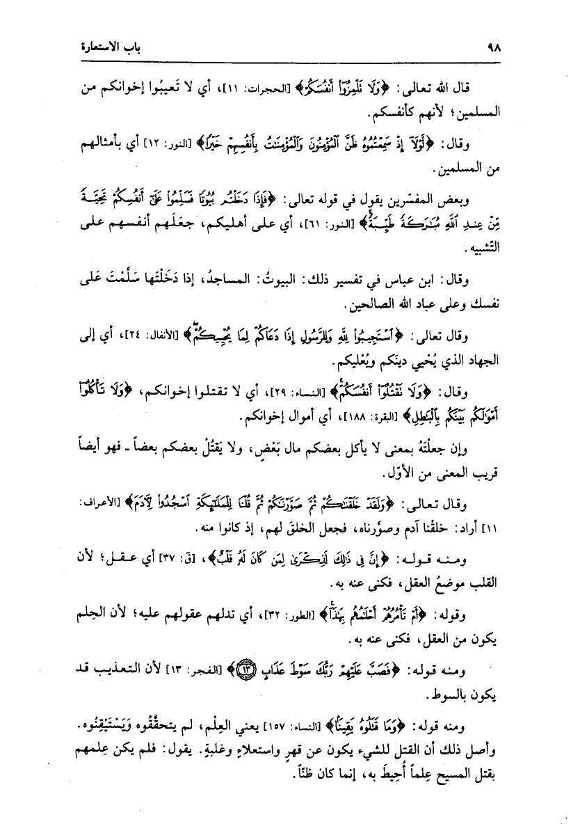 وقال: وَلا تَقْتُلُوا أَنْفُسَكُمْ [النساء: 29] ، أي لا تقتلوا إخوانكم، وَلا تَأْكُلُوا أَمْوالَكُمْ بَيْنَكُمْ بِالْباطِلِ [البقرة: 188] ، أي أموال إخوانكم.
