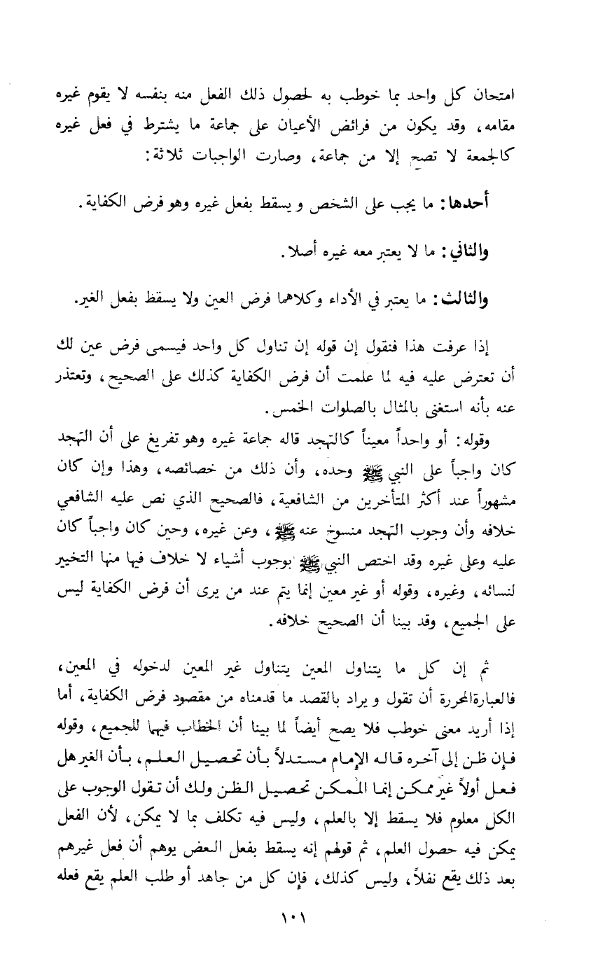 امتحان كل واحد بما خوطب به لحصول ذلك الفعل منه بنفسه لا يقوم غيره مقامه وقد يكون من فرائض الأعيان على جماعة ما يشترط في فعل غيره كالجمعة لا تصح إلا من جماعة وصارت الواجبات ثلاثة: