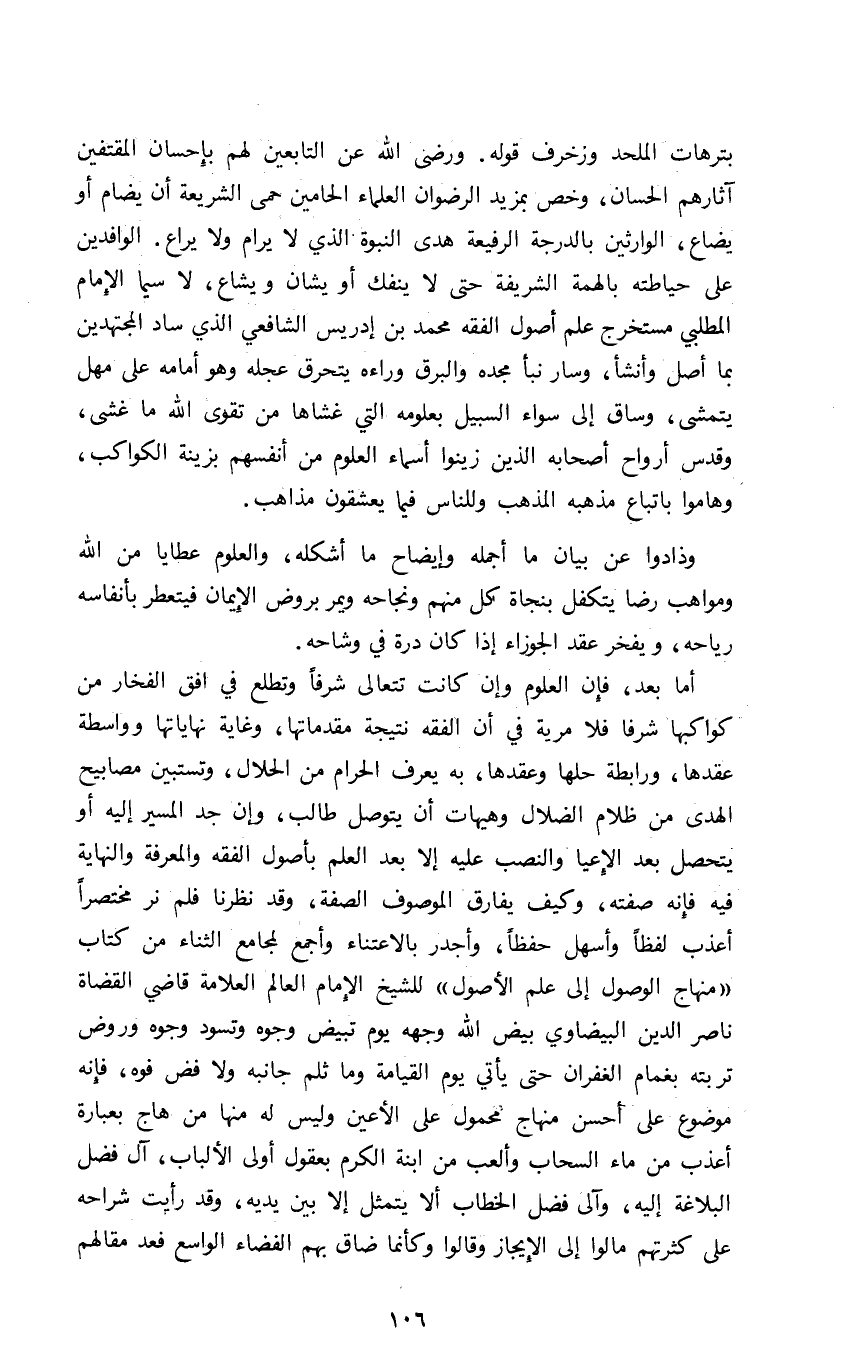بترهات الملحد وزخرف قوله: ورضي الله عن التابعين لهم بإحسان المقتفين آثارهم الحسان وخص بمزيد الرضوان العلماء الحامين حمى الشريعة أن يضام أو يضاع الوارثين بالدرجة الرفيعة هدى النبوة الذي لا يرام ولا يراع الوافدين على حياطته بالهمة الشريفة حتى لا ينفك أو يشان ويشاع لا سيما الإمام المطلبي مستخرج علم أصول الفقه محمد بن إدريس الشافعي الذي ساد المجتهدين بما أصل وأنشأ وسار نبأ مجده والبرق وراءه يتحرق عجله وهو أمامه على مهل يتمشى وساق إلى سواء السبيل بعلومه التي غشاها من تقوى الله ما غشى وقدس أرواح أصحابه الذين زينوا أسماء العلوم من أنفسهم بزينة الكواكب وهاموا باتباع مذهبه المذهب وللناس فيما يعشقون مذاهب.