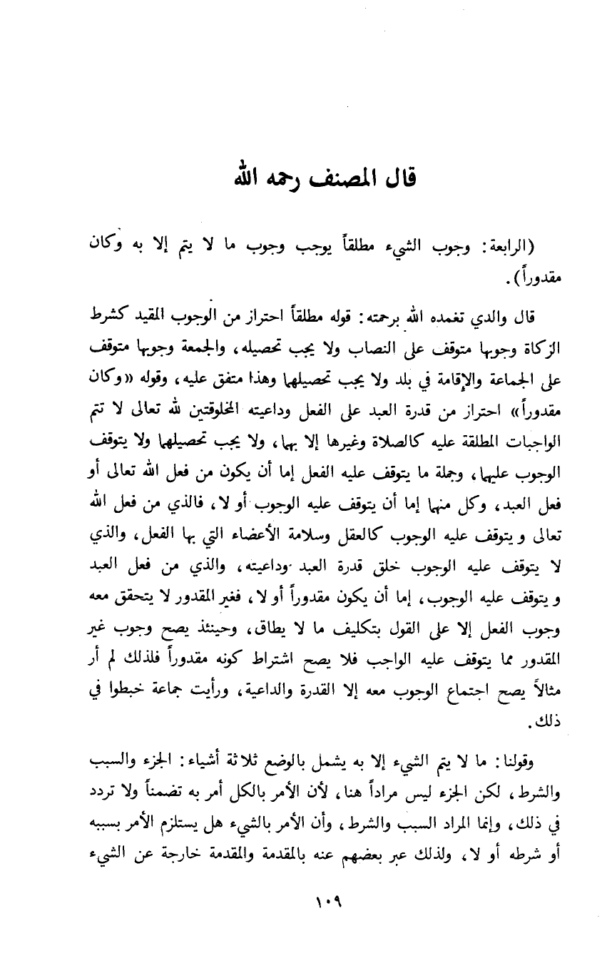 قال والدي تغمده الله برحمته قوله مطلقا احتراز من الوجوب المقيد كشرط الزكاة وجوبها متوقف على النصاب ولا يجب تحصيله والجمعة وجوبها متوقف على الجماعة والاقامة في بلد ولا يجب تحصيلهما وهذا متفق عليه وقوله: "وكان مقدورا" احتراز من قدرة العبد على الفعل وداعيته المخلوقتين لله تعالى لا تتم الواجبات المطلقة عليه كالصلاة وغيرها إلا بهما ولا يجب تحصيلهما ولا يتوقف الوجوب عليهما وجملة ما يتوقف عليه الفعل اما أن يكون من فعل الله تعالى أو فعل العبد وكل منهما إما أن يتوقف عليه الوجوب اولا فالذي من فعل الله تعالى ويتوقف عليه الوجوب كالعقل وسلامة الأعضاء التي بها الفعل والذي لا يتوقف عليه الوجوب خلق قدرة العبد وداعيته والذي من فعل العبد ويتوقف عليه الوجوب أما أن يكون مقدورا أولا فغير المقدور لا يتحقق معه وجوب الفعل إلا على القول بتكليف ما لا يطاق وحينئذ يصح وجوب غير المقدور مما يتوقف عليه الواجب فلا يصح اشتراط كونه مقدورا فلذلك لم أر مثالا يصح اجتماع الوجوب معه إلا القدرة والداعية ورأيت جماعة خطبوا في ذلك.