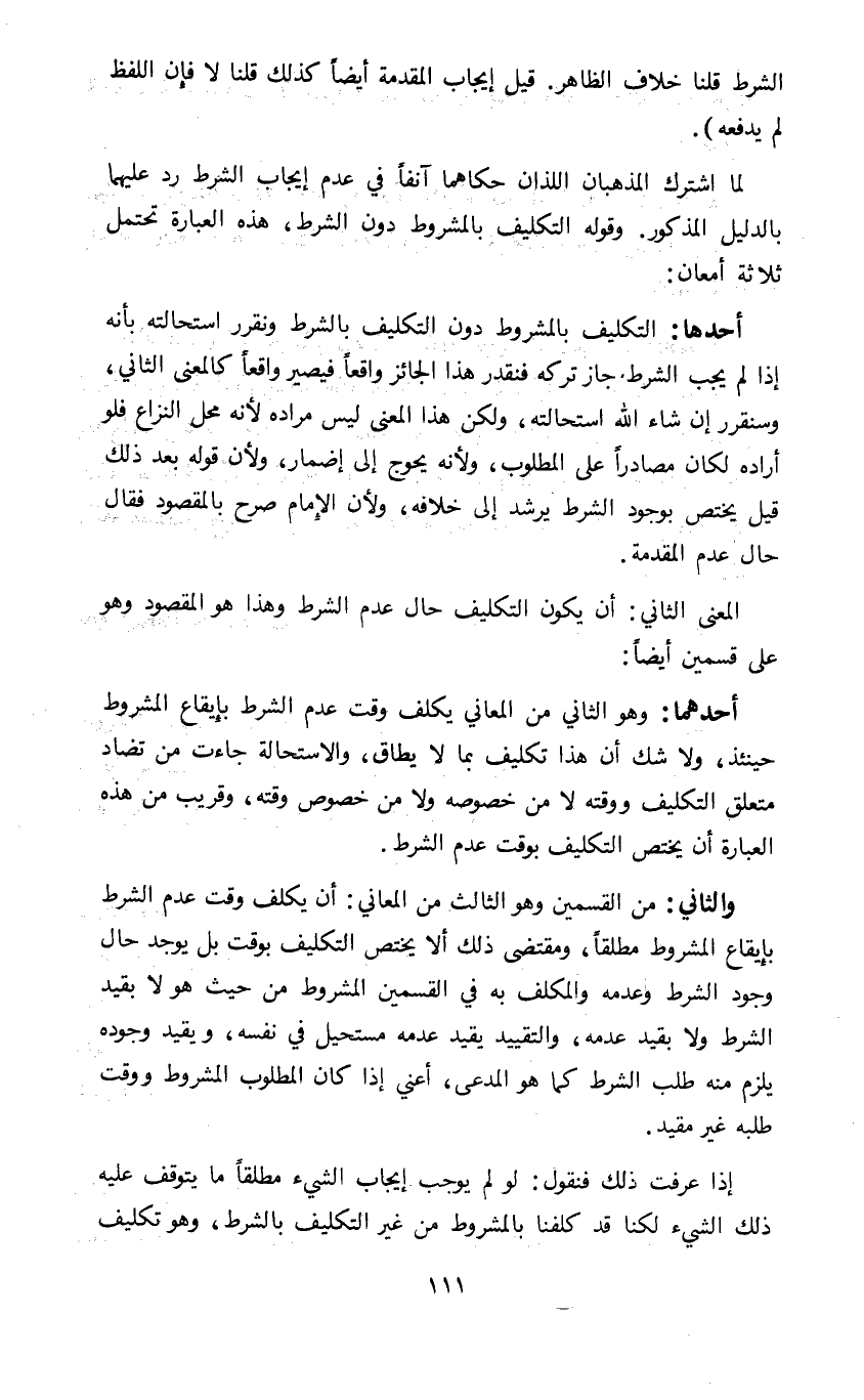 أحدهما: التكليف بالمشروط دون التكليف بالشرط ونقرر استحالته بأنه إذا لم يجب الشرط جاز تركه فنقدر هذا الجائز واقعا فيصير واقعا كالمعنى الثاني وسنقرر إن شاء الله استحالته ولكن هذا المعنى ليس مراده لأنه محل النزاع فلو أراده لكان مصادرا على المطلوب ولأنه يحوج إلى إضمار ولأن قوله بعد ذلك قيل يختص بوجود الشرط يرشد إلى خلافه ولأن الإمام صرح بالمقصود فقال حال عدم المقدمة.