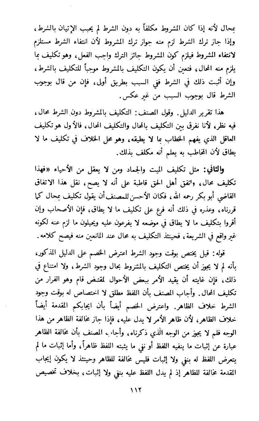 هذا تقرير الدليل وقول المصنف التكليف بالمشروط دون الشرط محال فيه نظر لأنا نفرق بين التكليف بالمحال والتكليف المحال فالأول هو تكليف العاقل الذي يفهم الخطاب بما لا يطيقه وهو محل الخلاف في تكليف ما لا يطاق لأن المخاطب به يعلم أنه مكلف بذلك.