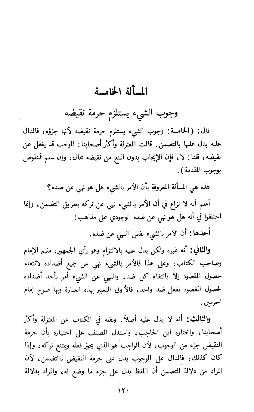 المسألة الخامسة وجوب الشيء يستلزم حرمة نقيضه