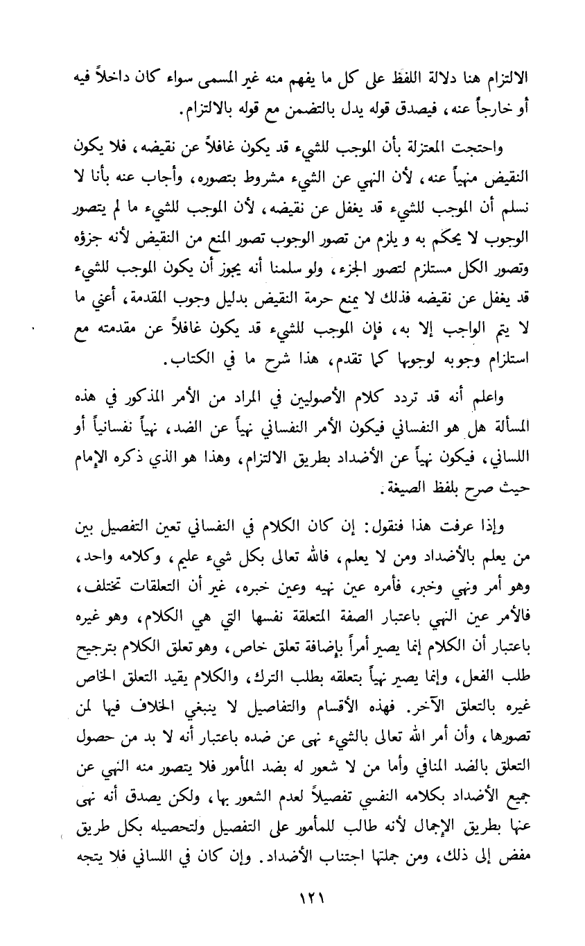 وإذا عرفت هذا فنقول: إن كان الكلام في النفساني تعين التفصيل بين من يعلم بالأضداد ومن لا يعلم فالله تعالى بكل شيء عليم وكلامه واحد وهو أمر ونهي وخبر فأمره عين نهيه وعين خبره غير أن التعلقات تختلف فالأمر عين النهي باعتبار الصفة المتعلقة نفسها التي هي الكلام وهو غيره باعتبار أن الكلام إنما يصير أمرا بإضافة تعلق خاص وهو تعلق الكلام بترجيح طلب الفعل وإنما يصير نهيا بتعلقه بطلب الترك والكلام يقيد التعلق الخاص غيره بالتعلق الآخر فهذه الأقسام والتفاصيل لا ينبغي الخلاف فيها لمن تصورها وأن أمر الله تعالى بالشيء نهى عن ضده باعتبار أنه لا بد من حصول التعلق بالضد المنافي وأما من لا شعور له بضد المأمور فلا يتصور منه النهي عن جميع الأضداد بكلامه النفسي تفصيلا لعدم الشعور بها ولكن يصدق أنه نهى عنها بطريق الإجمال لأنه طالب للمأمور على التفصيل ولتحصيله بكل طريق مفض إلى ذلك ومن جملتها اجتناب الأضداد وإن كان في اللساني فلا يتجه
