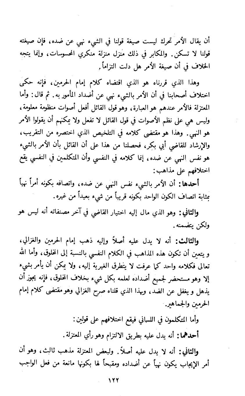 وهذا الذي قررناه هو الذي اقتضاه كلام إمام الحرمين فإنه حكى اختلاف أصحابنا في أن الأمر بالشيء نهي عن أضداد المأمور به ثم قال وأما المعتزلة فالأمر عندهم هو العبارة وهو قول القائل أفعل أصوات منظومة معلومة وليس هي على نظم الأصوات في قول القائل لا تفعل ولا يمكنهم أن يقولوا الأمر هو النهي وهذا هو مقتضى كلامه في التخليص الذي اختصره من التقريب والإرشاد للقاضي أبي بكر فحصلنا من هذا على أن القائل بأن الأمر بالشيء هو نفس النهي عن ضده إنما كلامه في النفسي وأن المتكلمين في النفسي يقع اختلافهم على مذاهب: