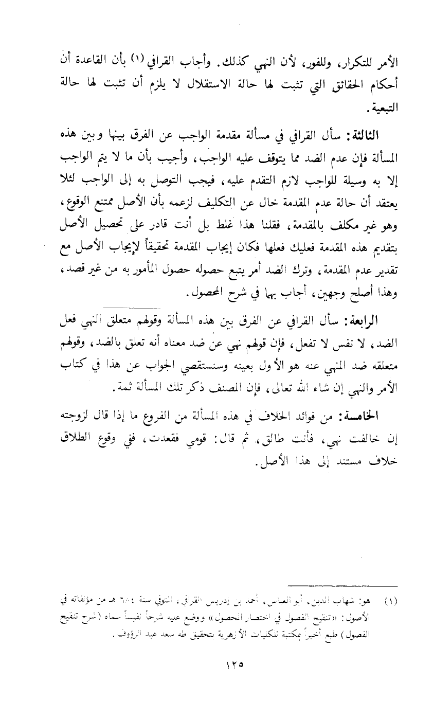 1 هو: شهاب الدين، أبو العباس، أحمد بن إدريس القرافي، المتوفى سنة 684هـ من مؤلفاته في الأصول: "تنقيح الفصول في اختصار المحصول" ووضع عليه شرحاً نفيسا سماه شرح تنقيح الفصول طبع أخيراً بمكتبة للكليات الأزهرية بتحقيق طه سعد عبد الرؤوف.