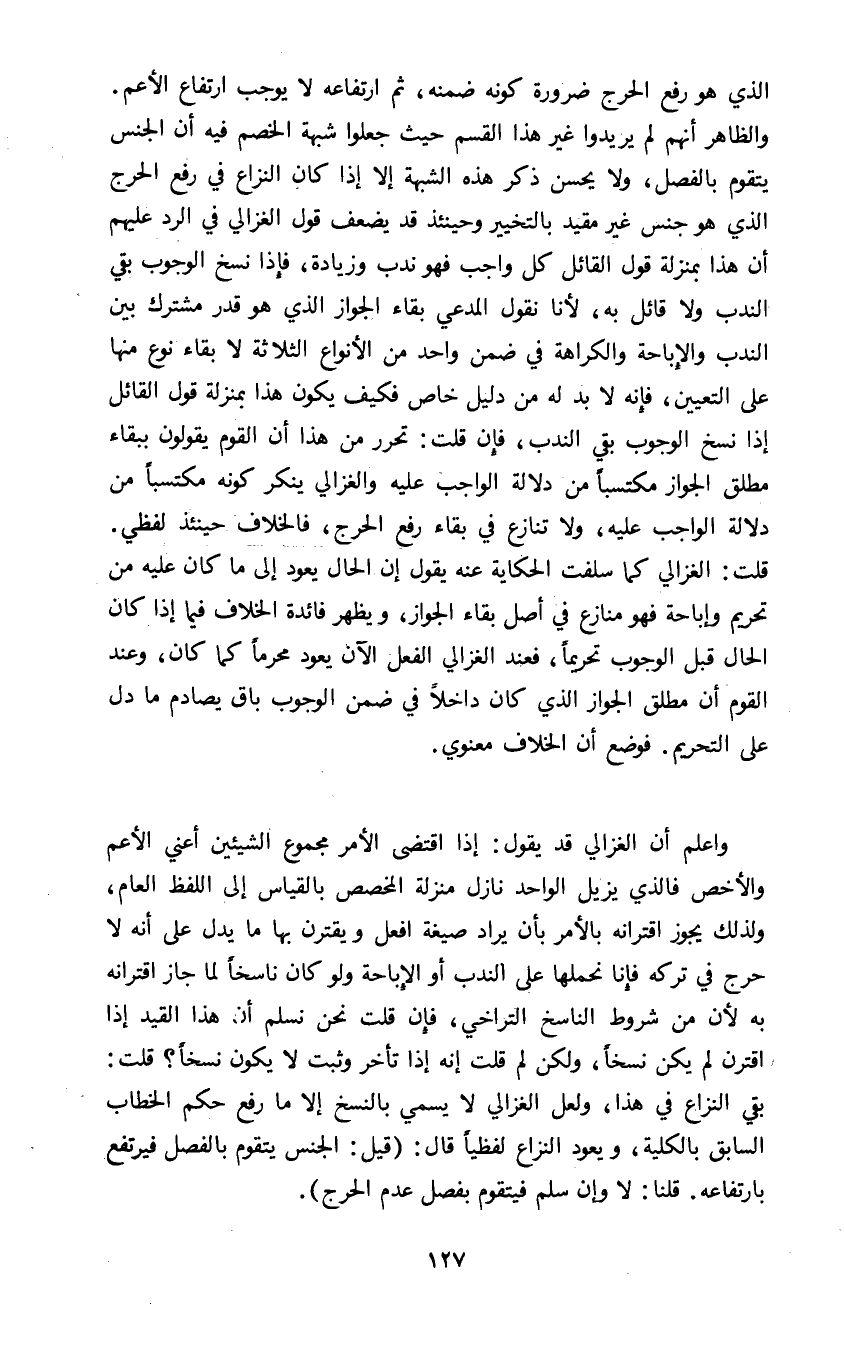 واعلم أن الغزالي قد يقول إذا اقتضى الأمر مجموع الشيئين أعني الأعم والأخص فالذي يزيل الواحد نازل منزلة المخصص بالقياس إلى اللفظ العام ولذلك يجوز اقترانه بالأمر بأن يراد صيغة افعل ويقترن بها ما يدل على أنه لا حرج في تركه فإنا نحملها على الندب أو الإباحة ولو كان ناسخا لما جاز اقترانه به لأن من شروط الناسخ التراخي فإن قلت نحن نسلم أن هذا القيد إذا اقترن لم يكن نسخا ولكن لم قلت إنه إذا تأخر وثبت لا يكون نسخا قلت بقي النزاع في هذا ولعل الغزالي لا يسمي بالنسخ إلا ما رفع حكم الخطاب السابق بالكلية ويعود النزاع لفظيا قال: "قيل: الجنس يتقوم بالفصل فيرتفع بارتفاعه قلنا لا وإن سلم فيتقوم بفصل عدم الحرج".
